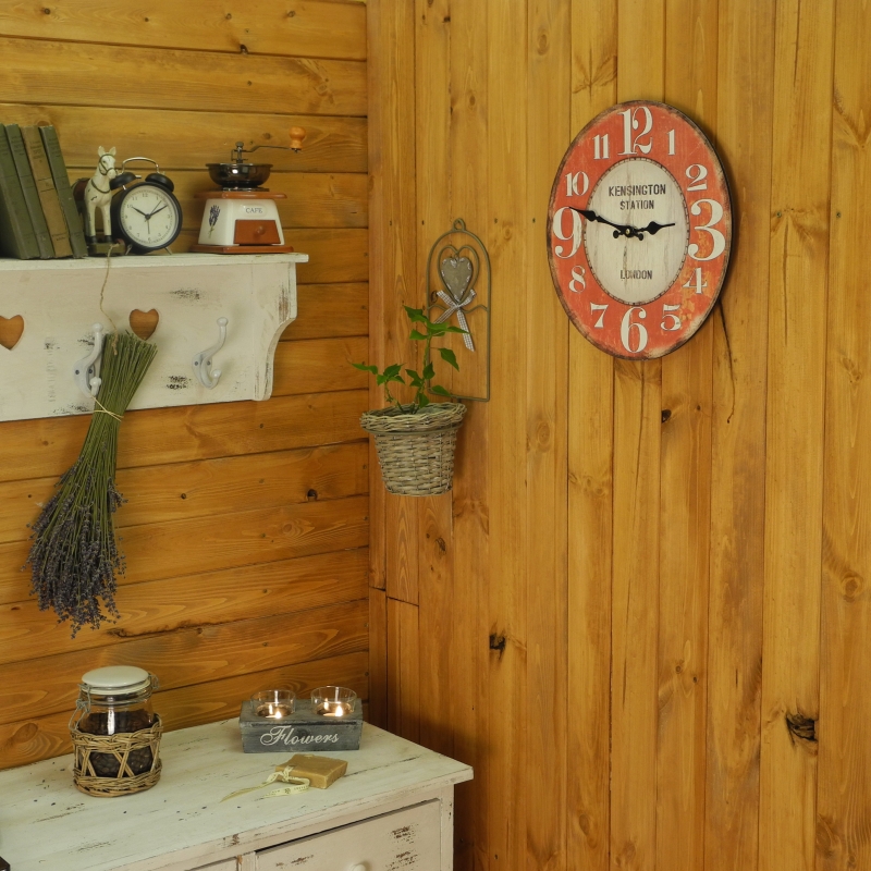 Nástěnné hodiny budou nepřehlédnutelné díky výrazné červené barvě a velkým bílým číslicím na ciferníku z recyklovaného materiálu. Mezi jednotlivými arabskými čísly jsou zvláště zvýrazněny cifry tři, šest, devět a dvanáct.