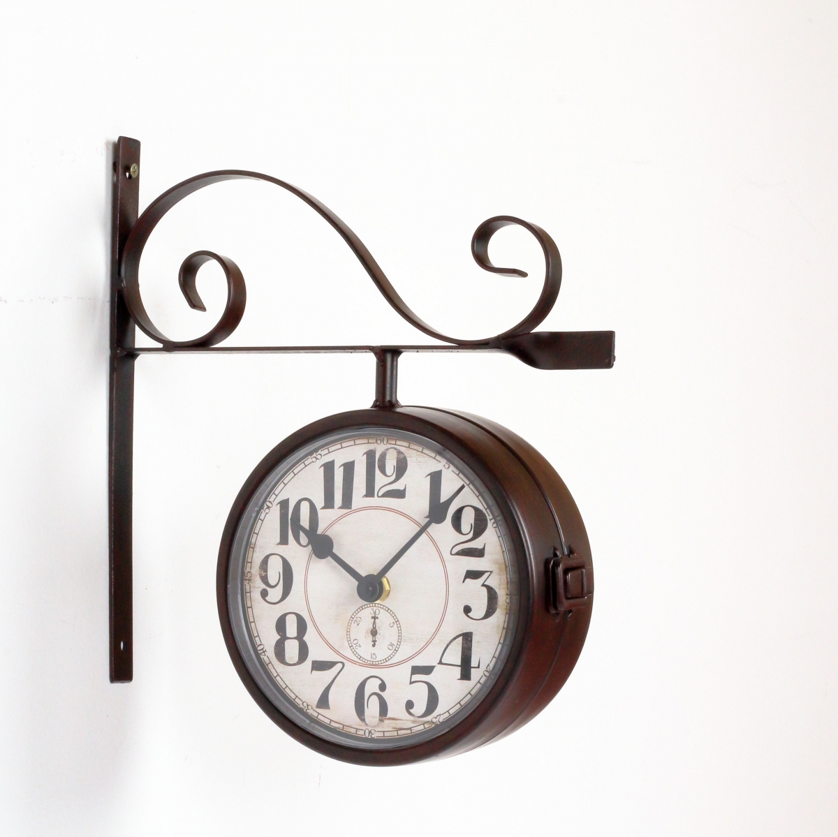 Nástěnné hodiny oboustranné kovové pr. 16cm na dlouhou stěnu v chodbě nebo na sloup pod pergolou. Jaké místo jim vymyslíte Vy?