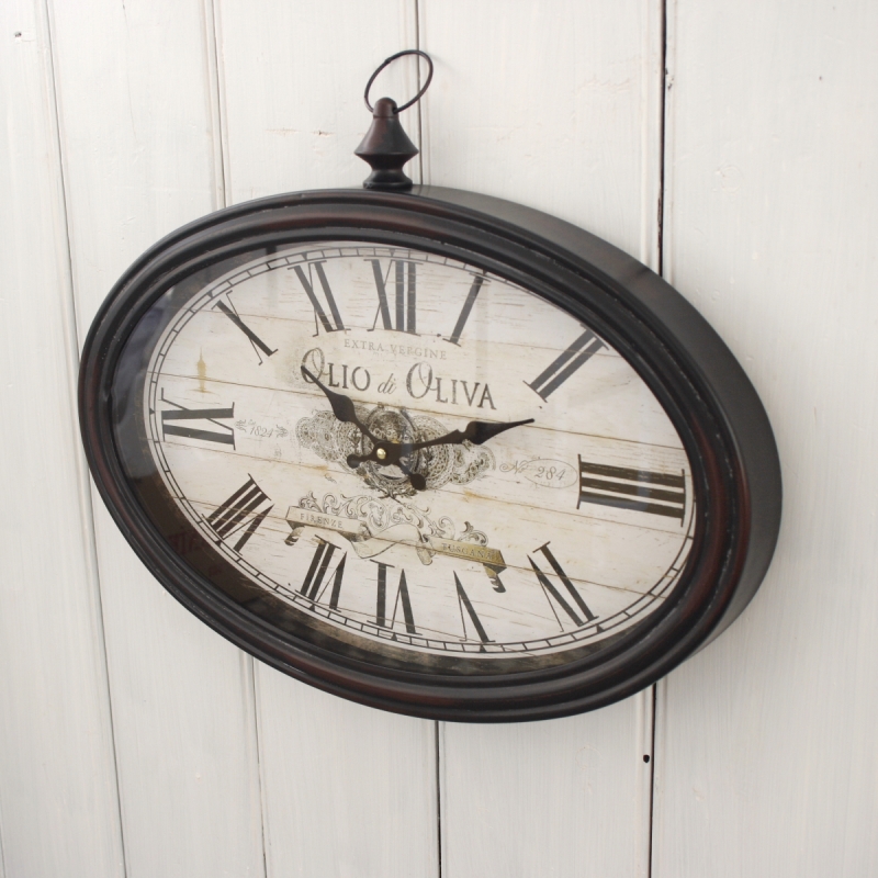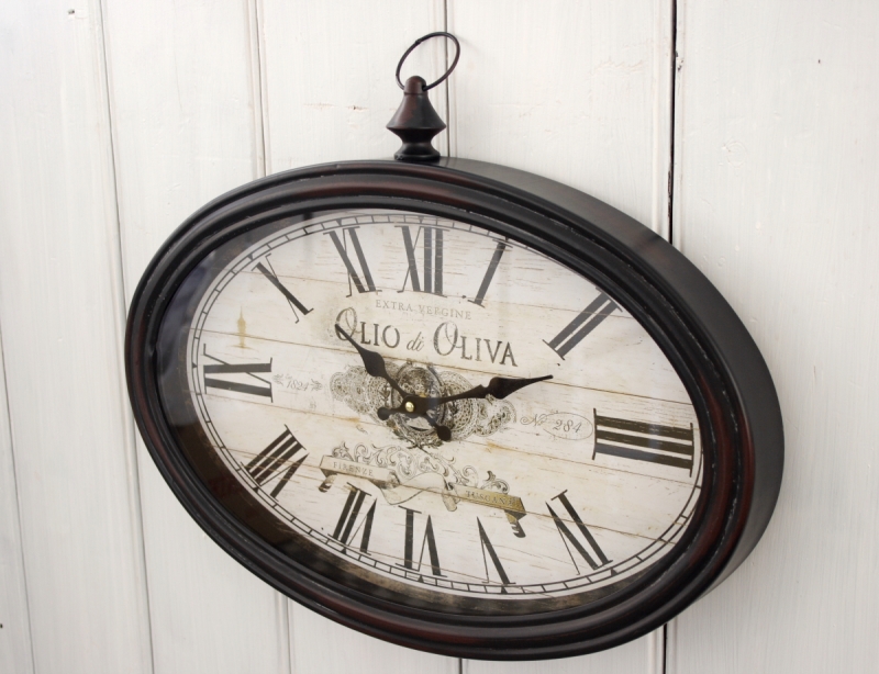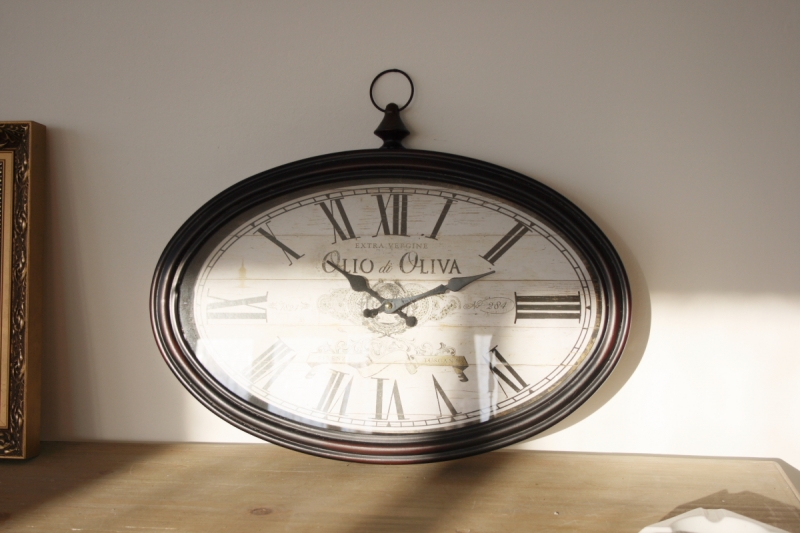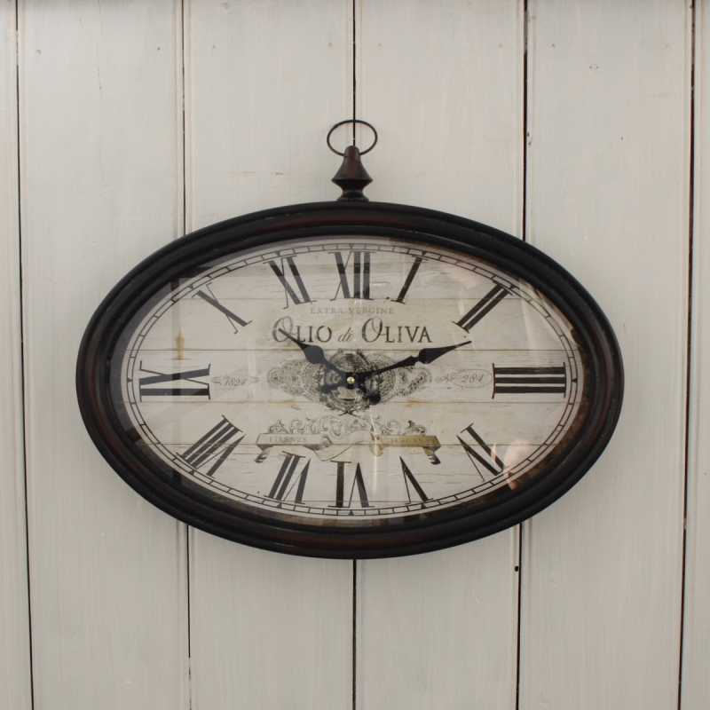 Nádherné kovové hodiny oválného tvaru mají vintage ciferník s nápisy týkající se extra panenského olivového oleje. Jsou vhodné jako dekorace do kuchyně či jídelny.