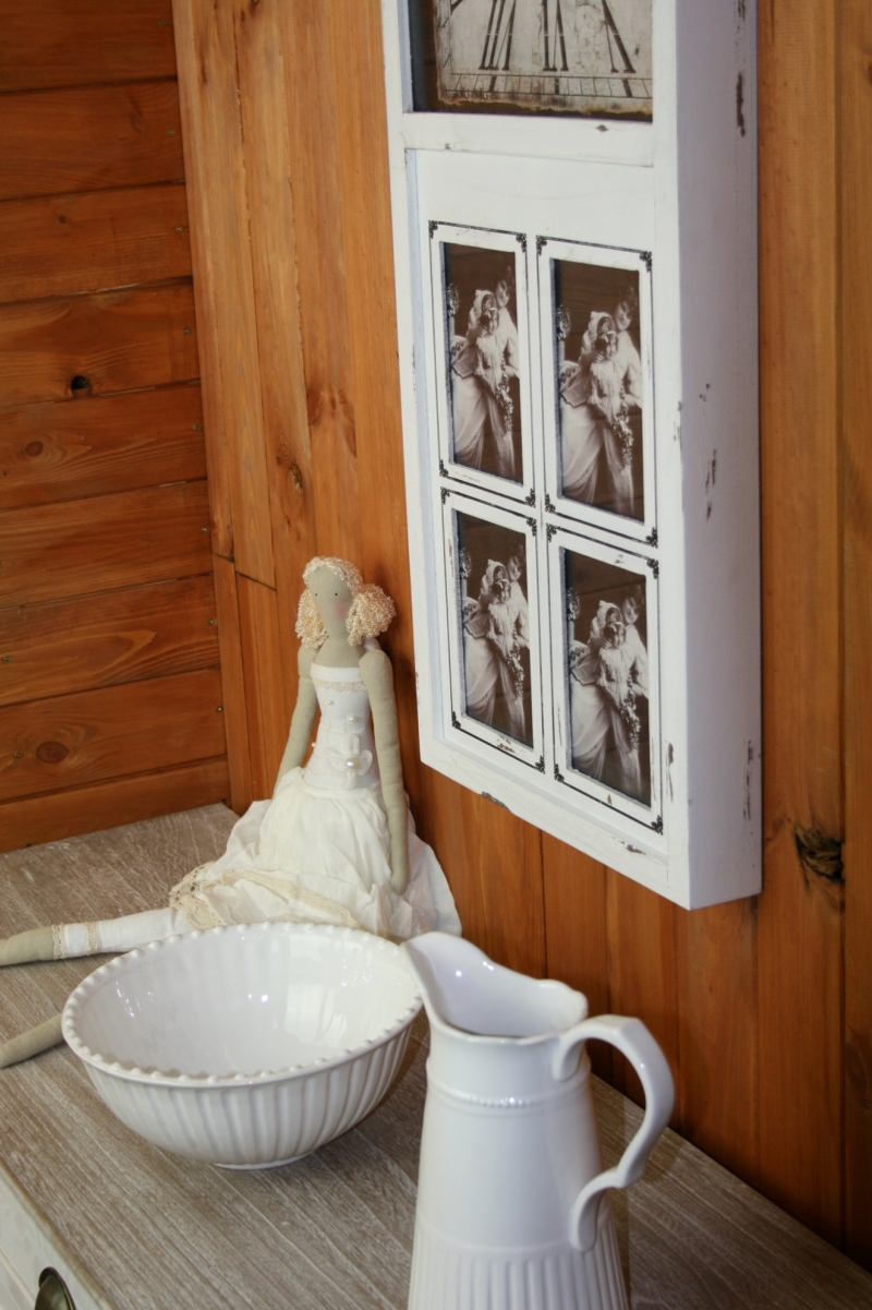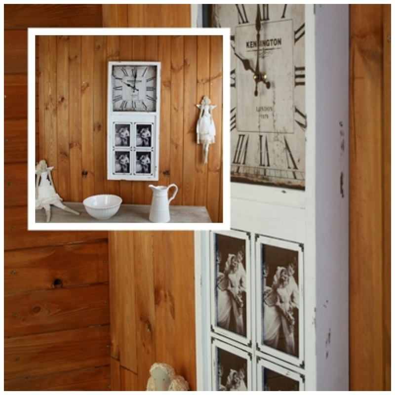 Nástěnné hodiny ze dřeva mají bílý nátěr s patinou a oprýskaným vzhledem. Samotné hodiny jsou umístěné v horní části rámu, černé římské číslice vypadají na světlém, jakoby časem poznamenaném, podkladu velmi efektně. Ve spodní části je místo na uložení čtyř fotografií o velikosti 10x15cm.