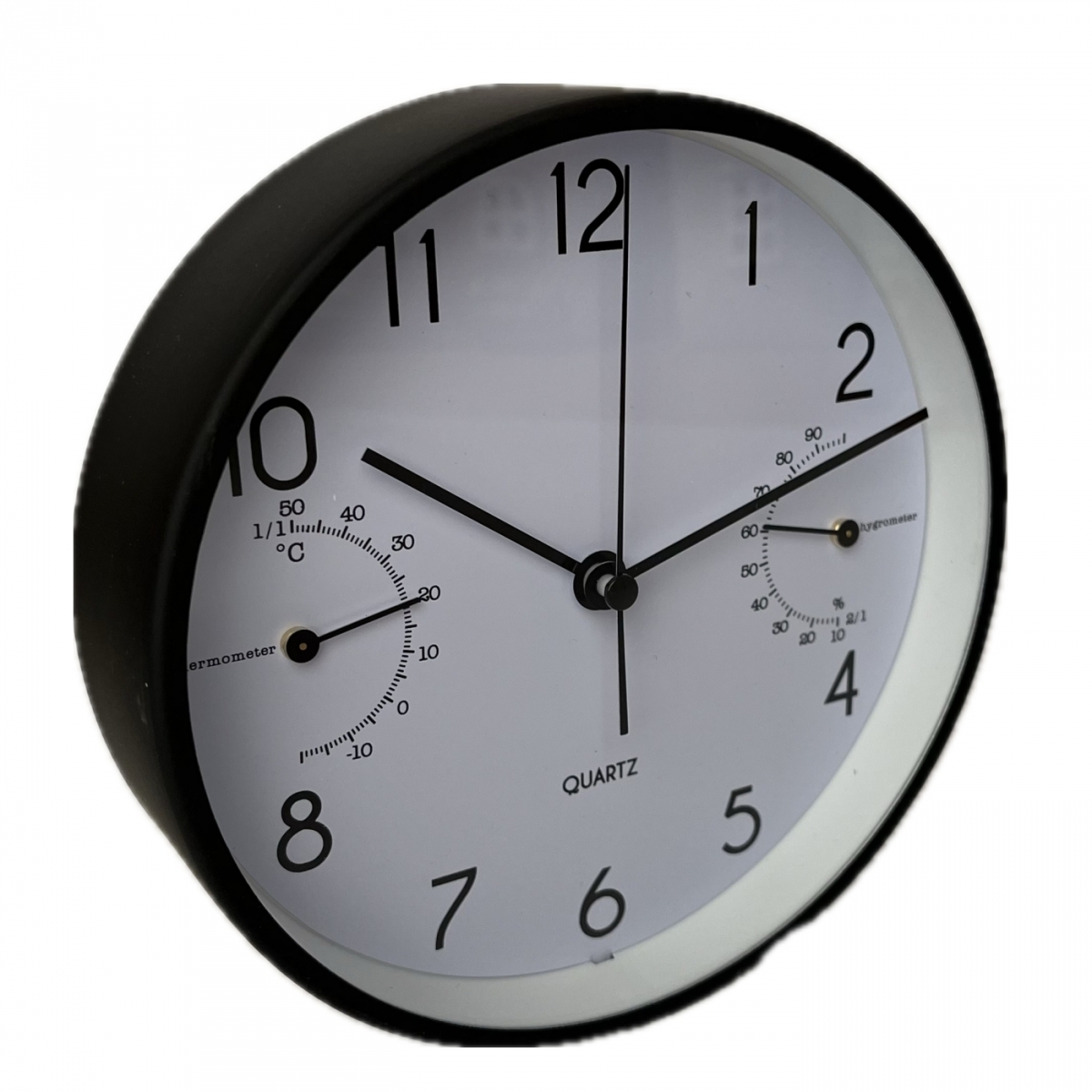 Nástěnné hodiny do interiéru s vlhkoměrem a teploměrem současně. Barva černá.