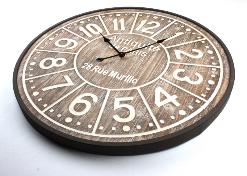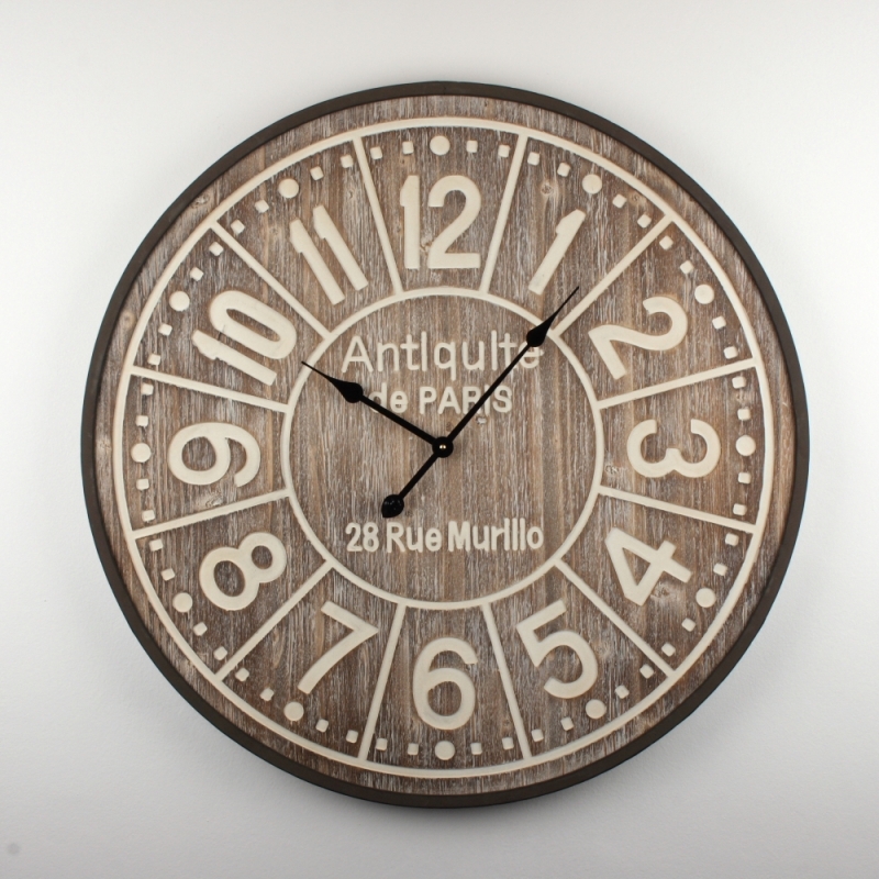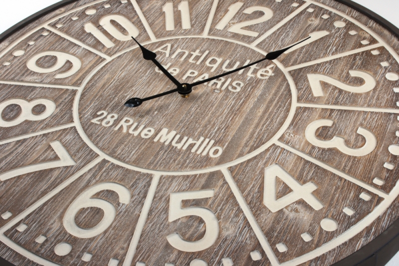 Velké nástěnné hodiny kulaté vintage hodiny Antiquite de Paris 80cm ze dřeva s krásnou strukturou a pitnou na povrchu.
