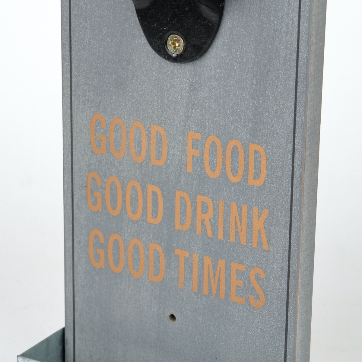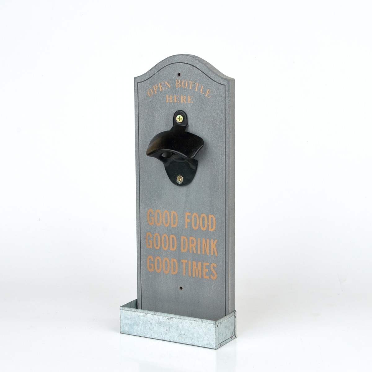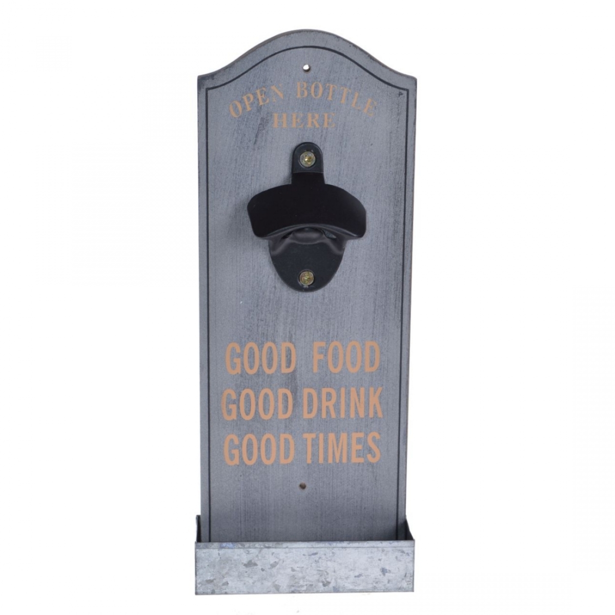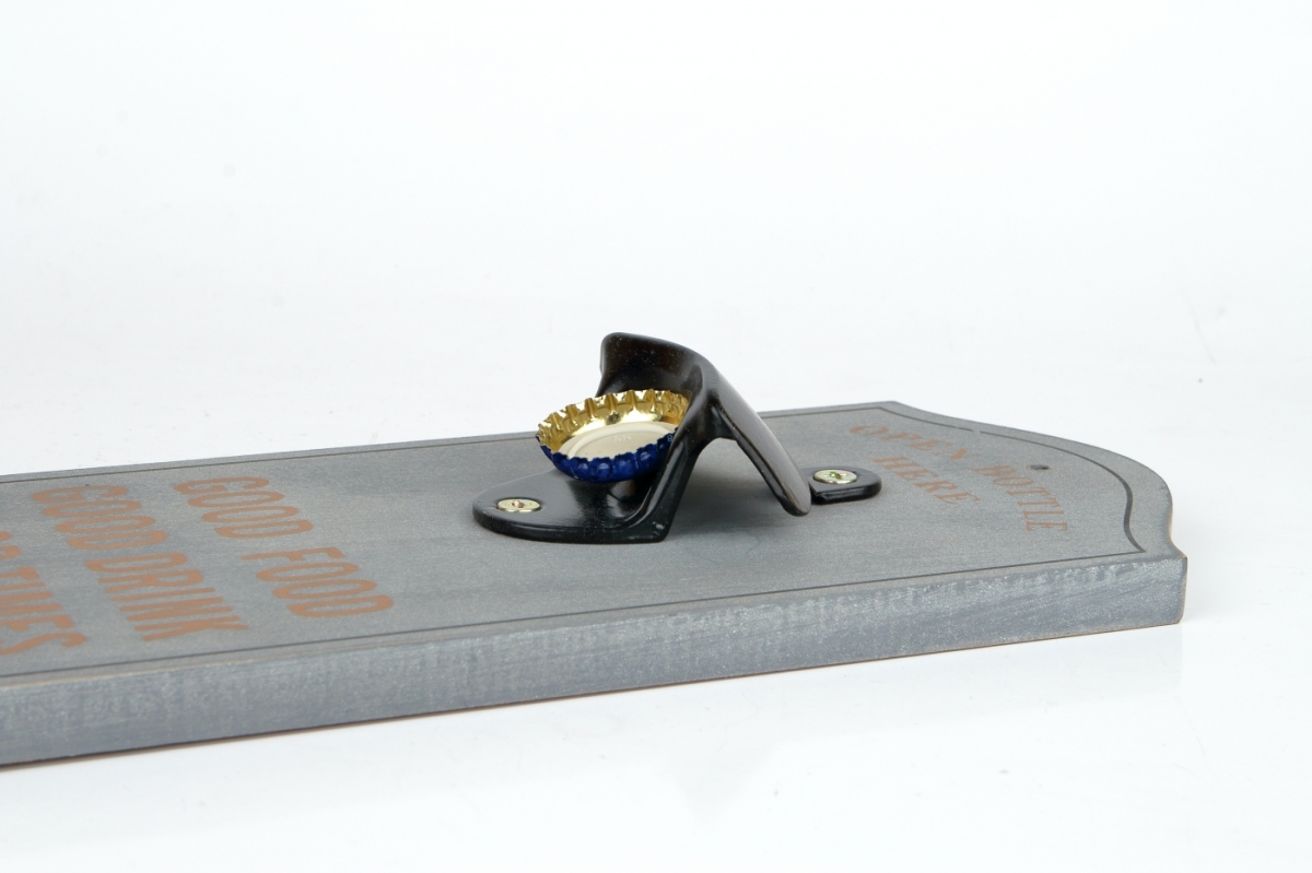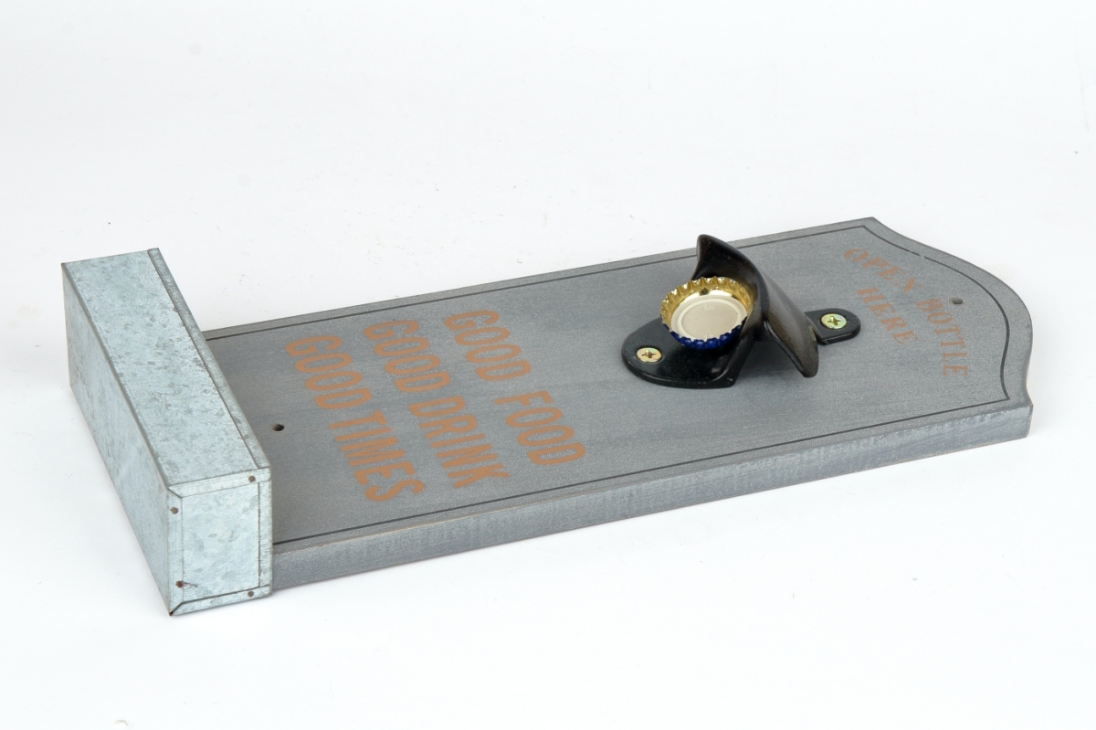 Nástěnný otvírák na pivo snadno připevníte dvěmi vrruty do trámy pergoly, nebo stěny místnosti. Odkládací polička na pivní zátky je vyrobena z hliníkového plechu. Samotný otvírák na pivo je kovový, již připevněný na dřevěném podkladu.