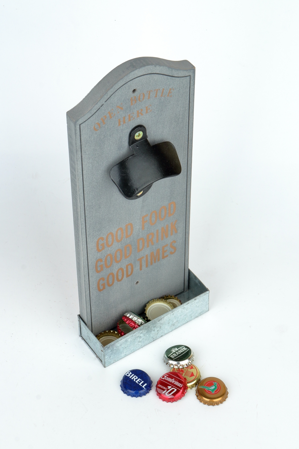 Nástěnný otvírák na pivo se žlábkem pro odkládání vršků z láhví.