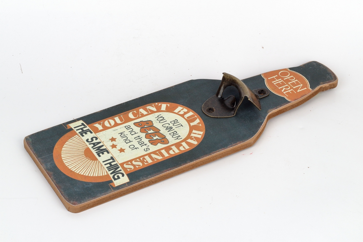 Deska ve tvaru láhve je opatřena v horní části samotným kovovým otvírákem na lahve s korunkovými uzávěry a je ozdobená stylovými retro nápisy.