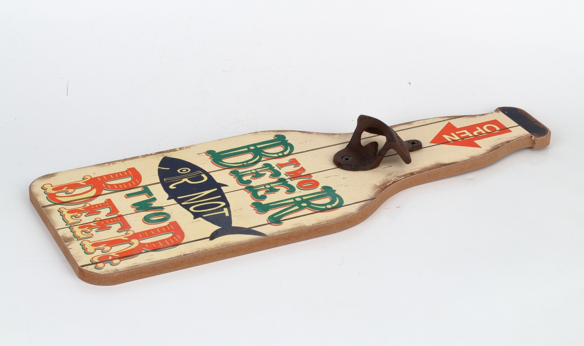 Deska ve tvaru láhve je opatřena v horní části samotným kovovým otvírákem na lahve s korunkovými uzávěry a je ozdobená stylovými retro nápisy.