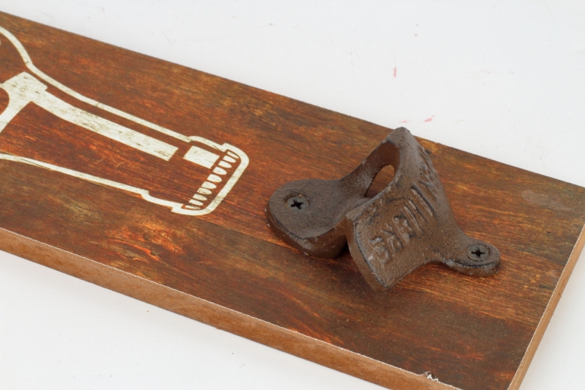 Deska ve tvaru láhve je opatřena v horní části samotným kovovým otvírákem na lahve s korunkovými uzávěry a je ozdobená stylovými retro nápisy.