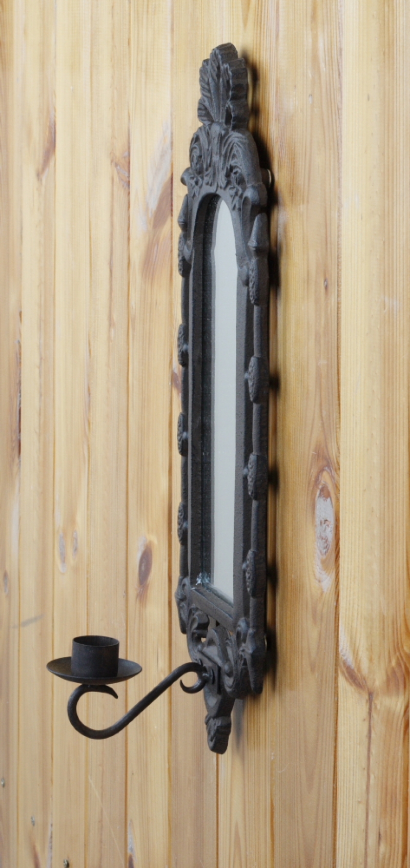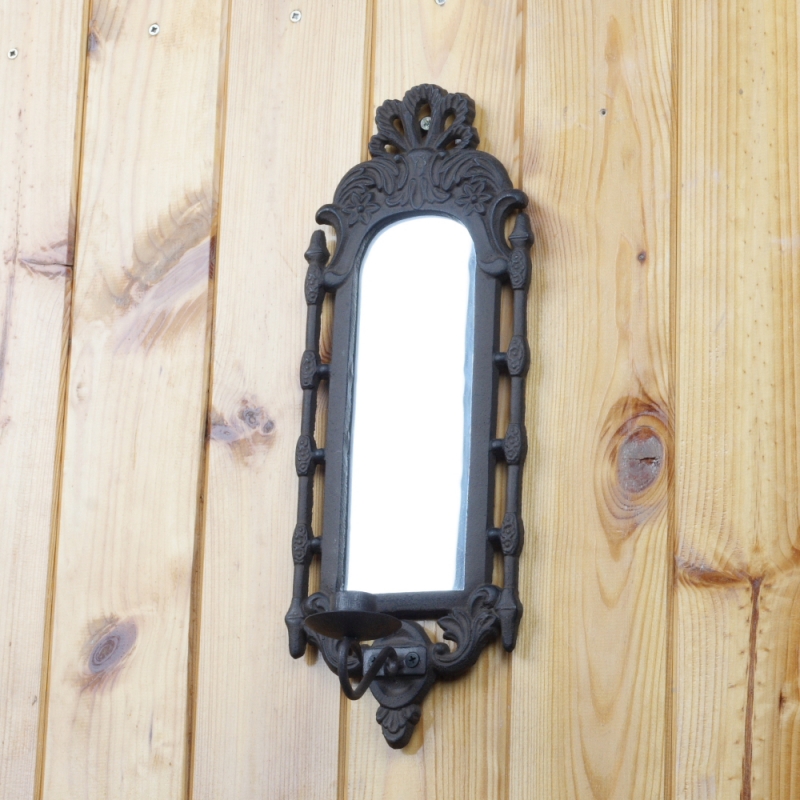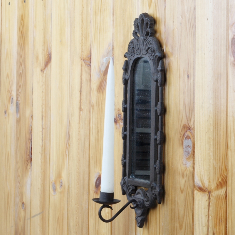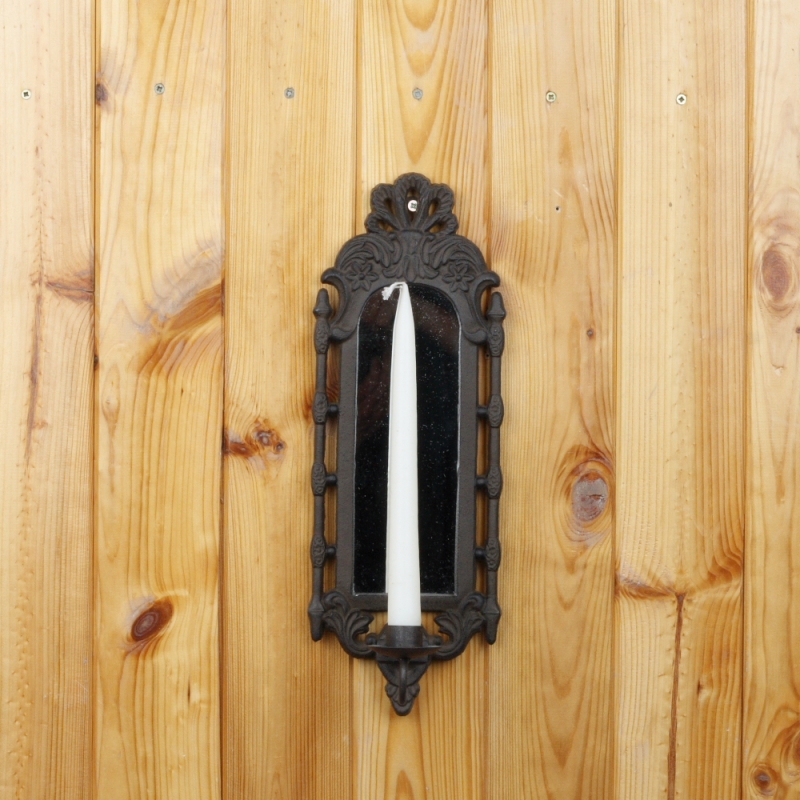 Netradičně řešený nástěnný svícen z litiny je určen na jednu vysokou svíčku, za kterou je vsazeno zrcadlo. Světlo svíčky tak bude zrcadlo odrážet a vytvářet v prostoru krásné tlumené světlo.