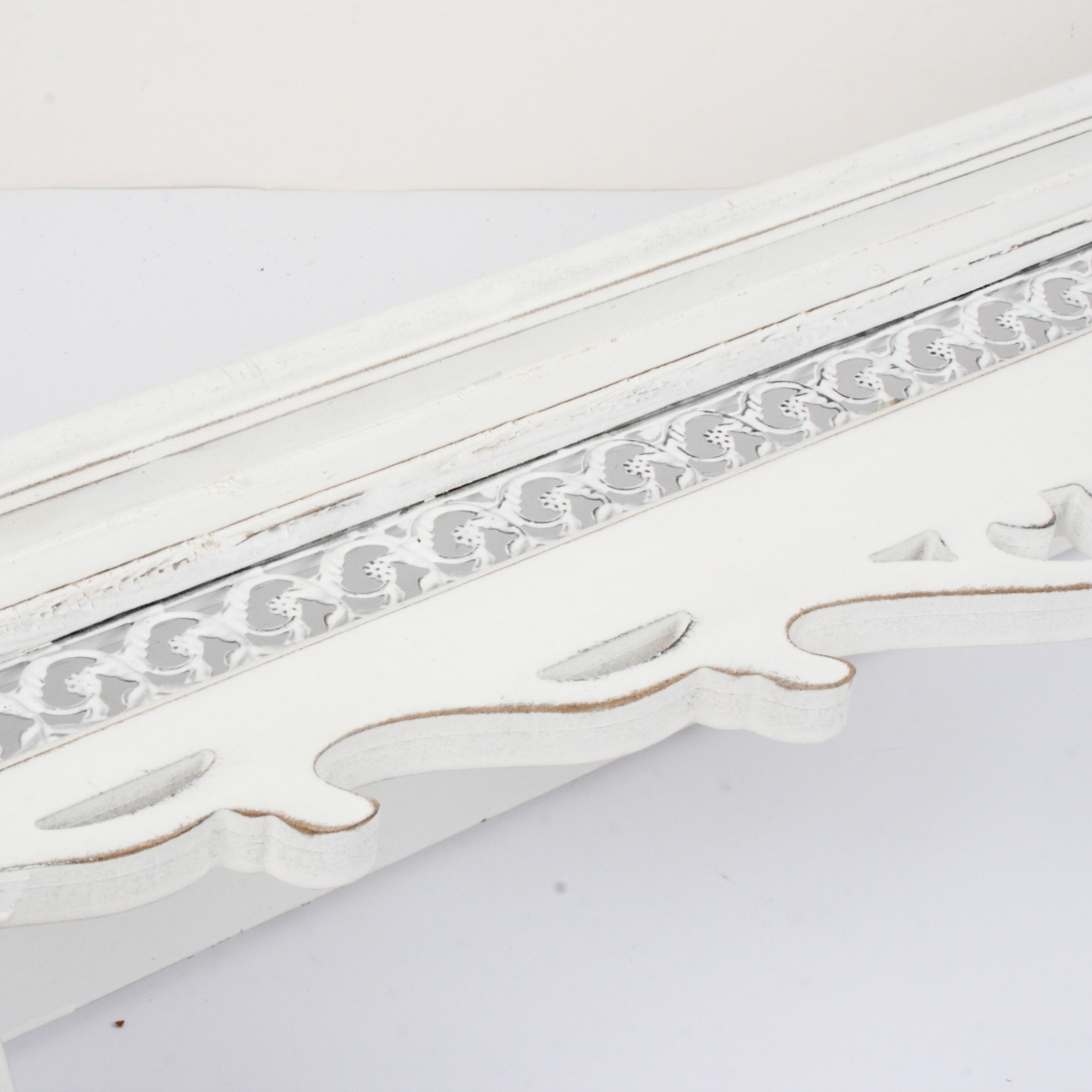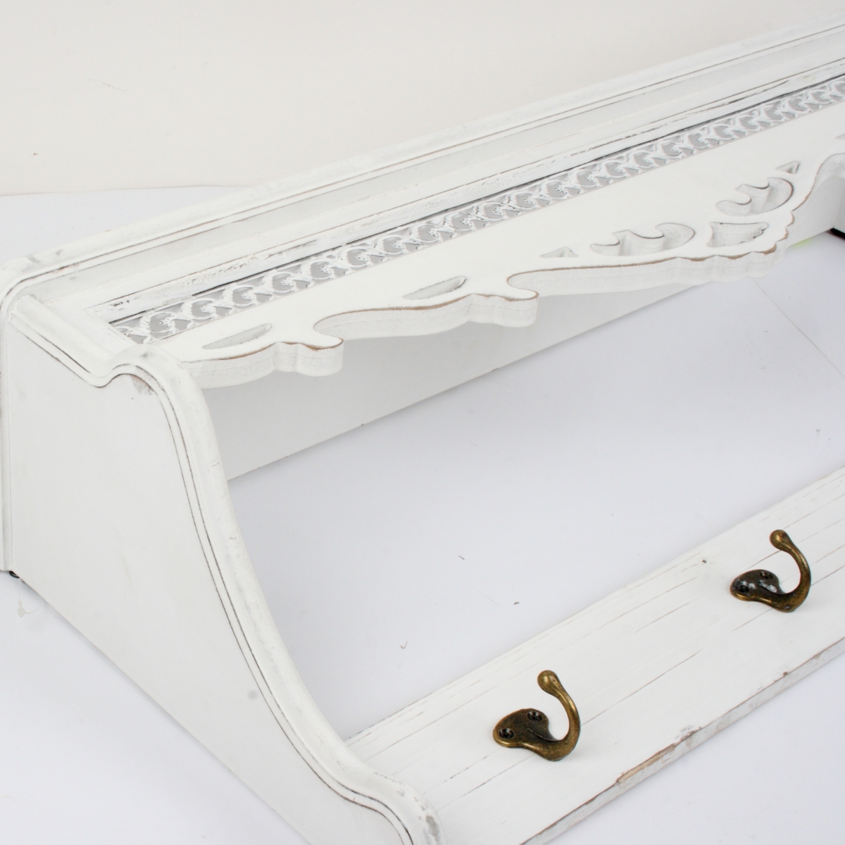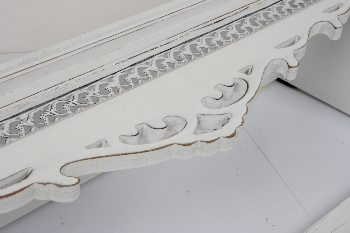 Nástěnný věšák dřevěný s policí bílý 76x18x32cm a krásnou zdobenou římskou.