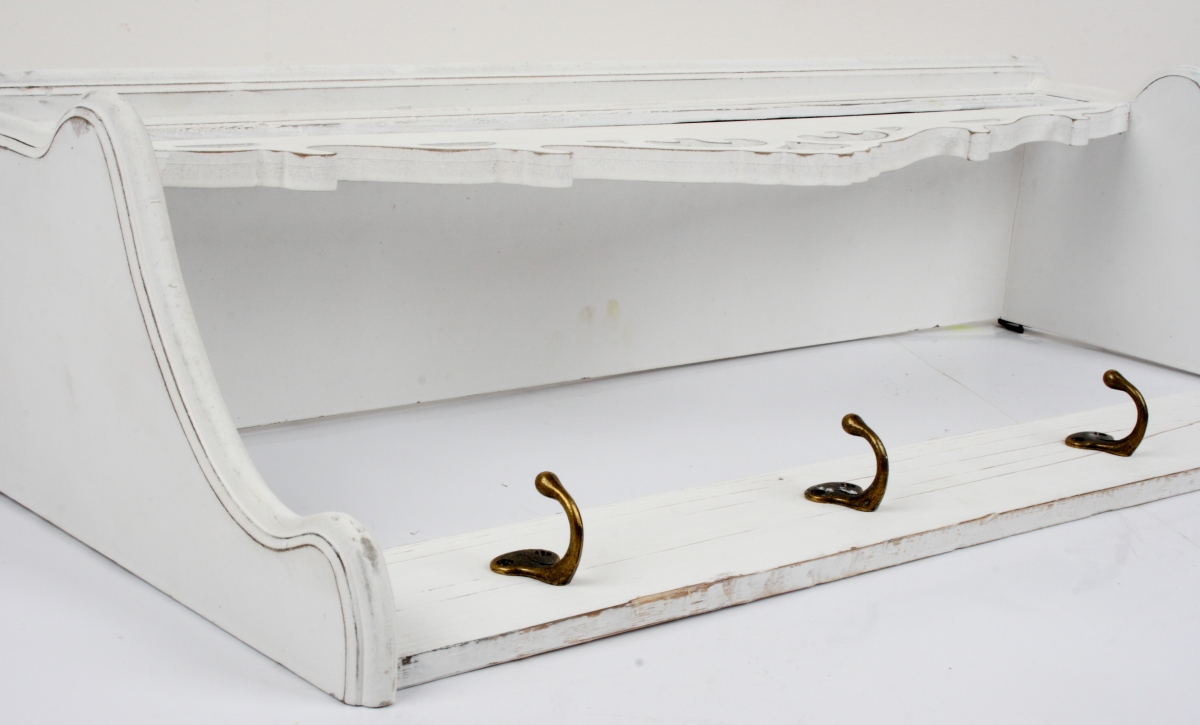 Nástenný vešiak drevený s policou biely a krásnu zdobenou rímsku.
