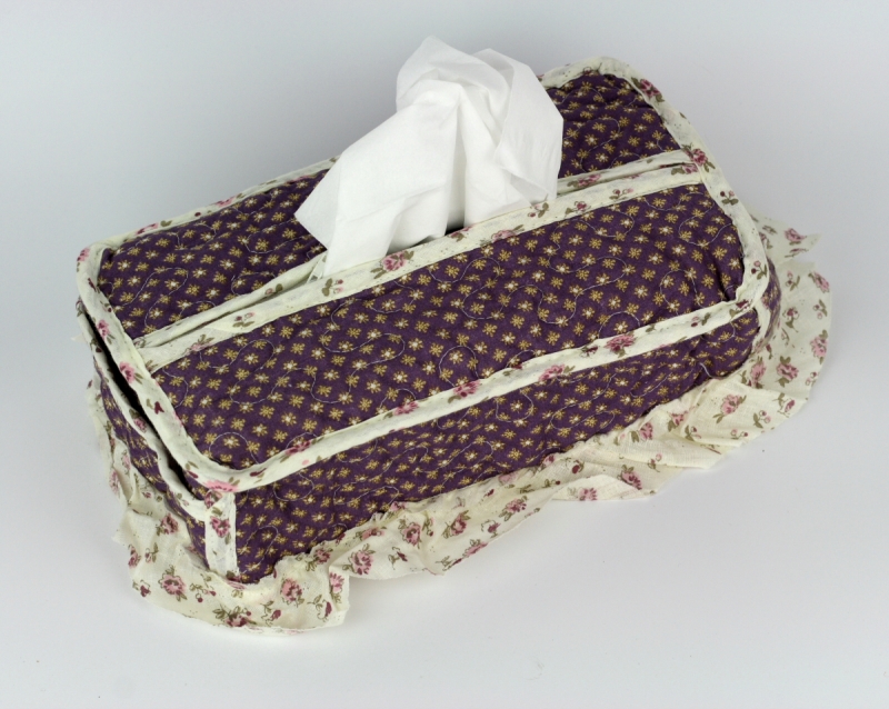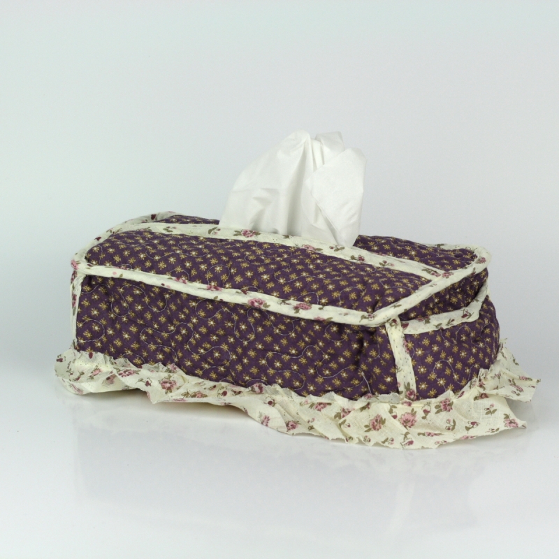 Návlek je ušitý z krásné květinové látky v tmavě fialové a krémové barvě. Jednoduše jej navléknete na krabičku a ze spod zajistíte dvěma všitými gumičkami, aby bylo možné krabičku i bez problémů přenášet.