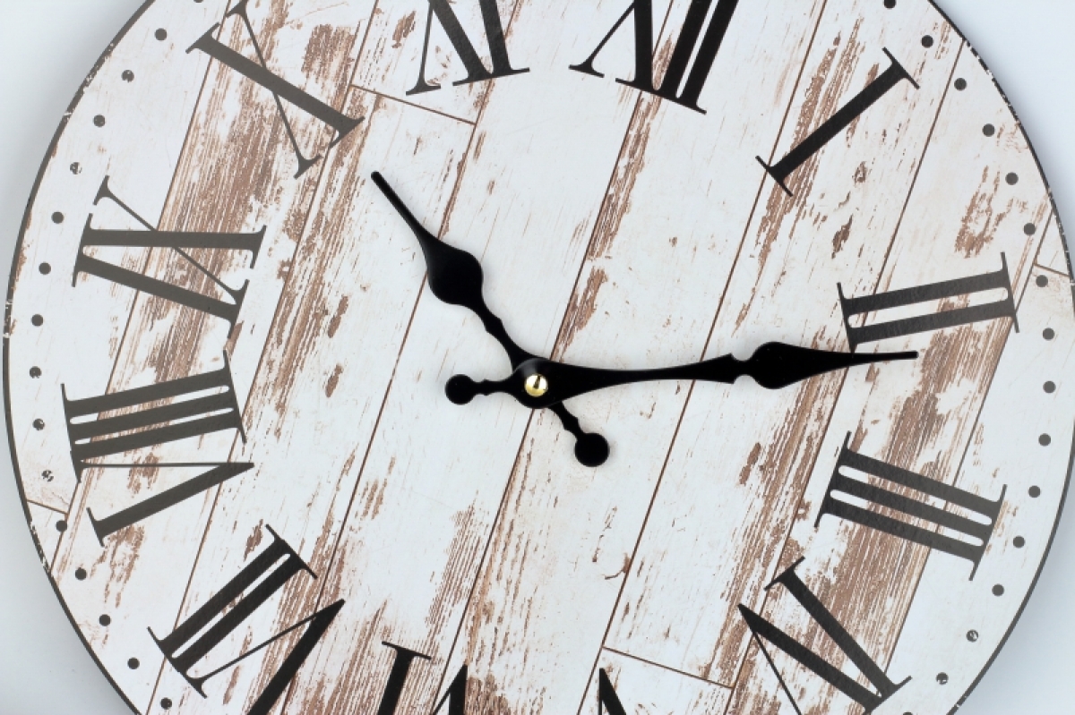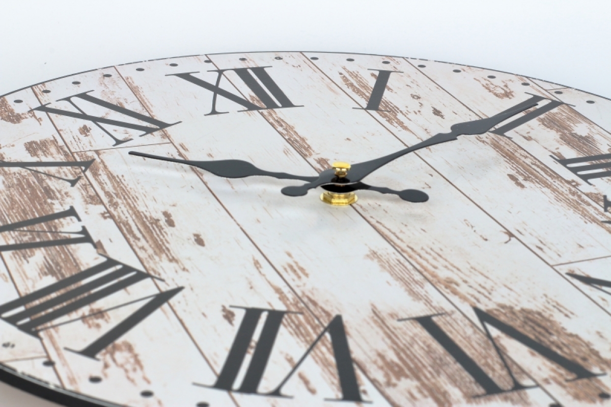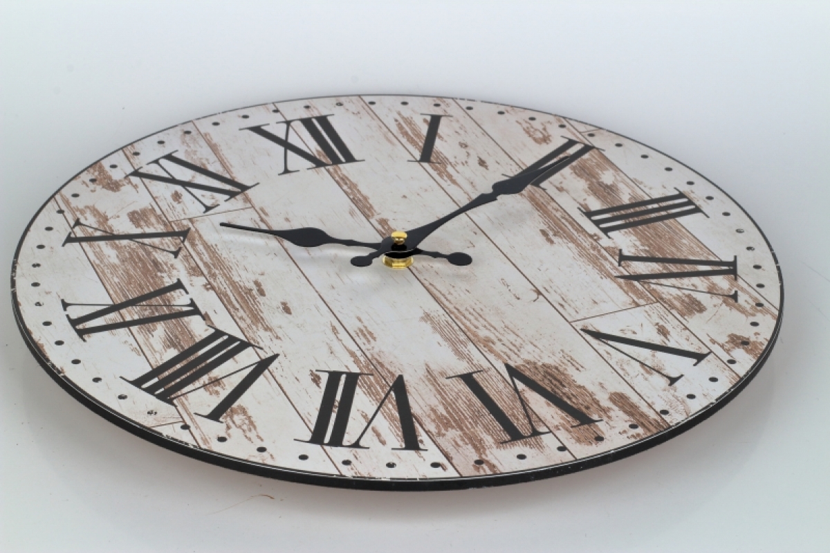 Krásné nástěnné hodiny s ciferníkem v prkenném vzhledu jsou doplněny o velké, dobře čitelné římské číslice. Oprýskaný vzhled je velmi moderní.