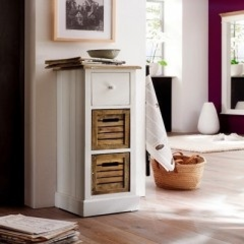 Obsahuje tři zásuvky, vrchní je bílá, spodní dvě jsou v barvě dřeva. Jejich přední strana připomíná bedničky na ovoce – mezi jednotlivými laťkami jsou větrací otvory.