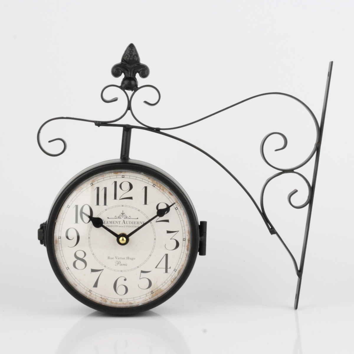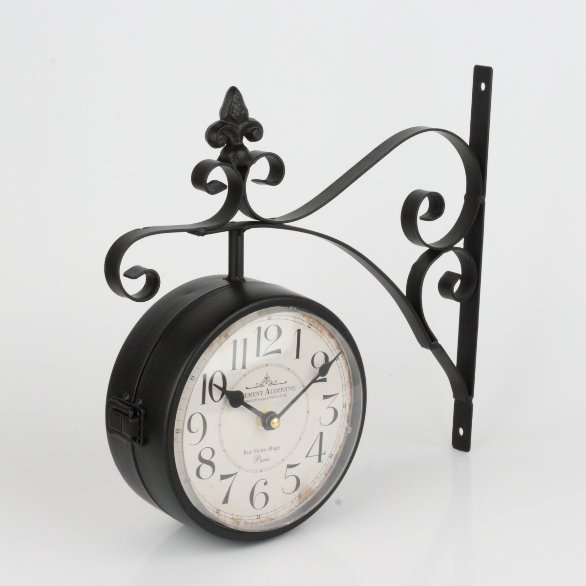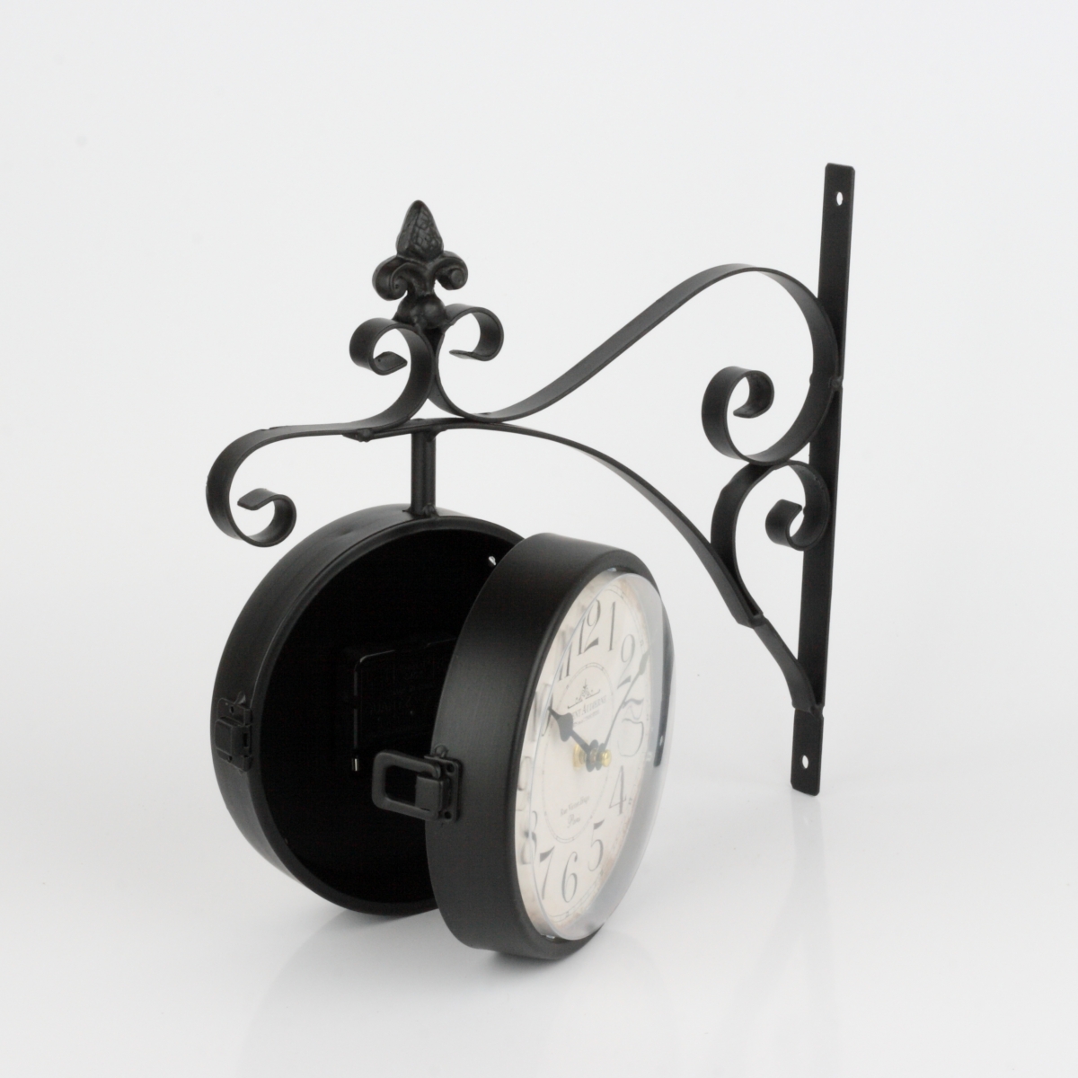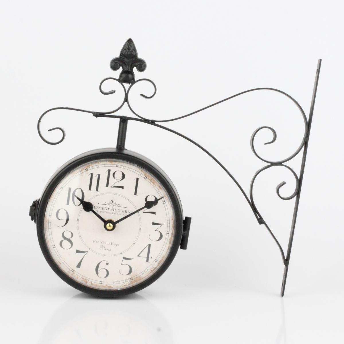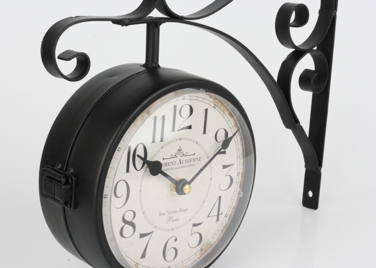 Oboustranné hodiny s arabskými číslicemi Clement 31x28x7cm a tmavou konzolí se zdobeným hrotem.