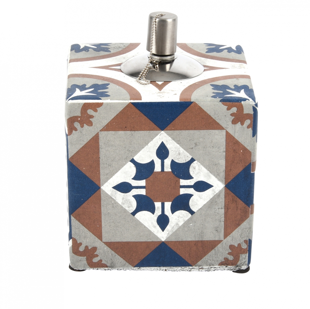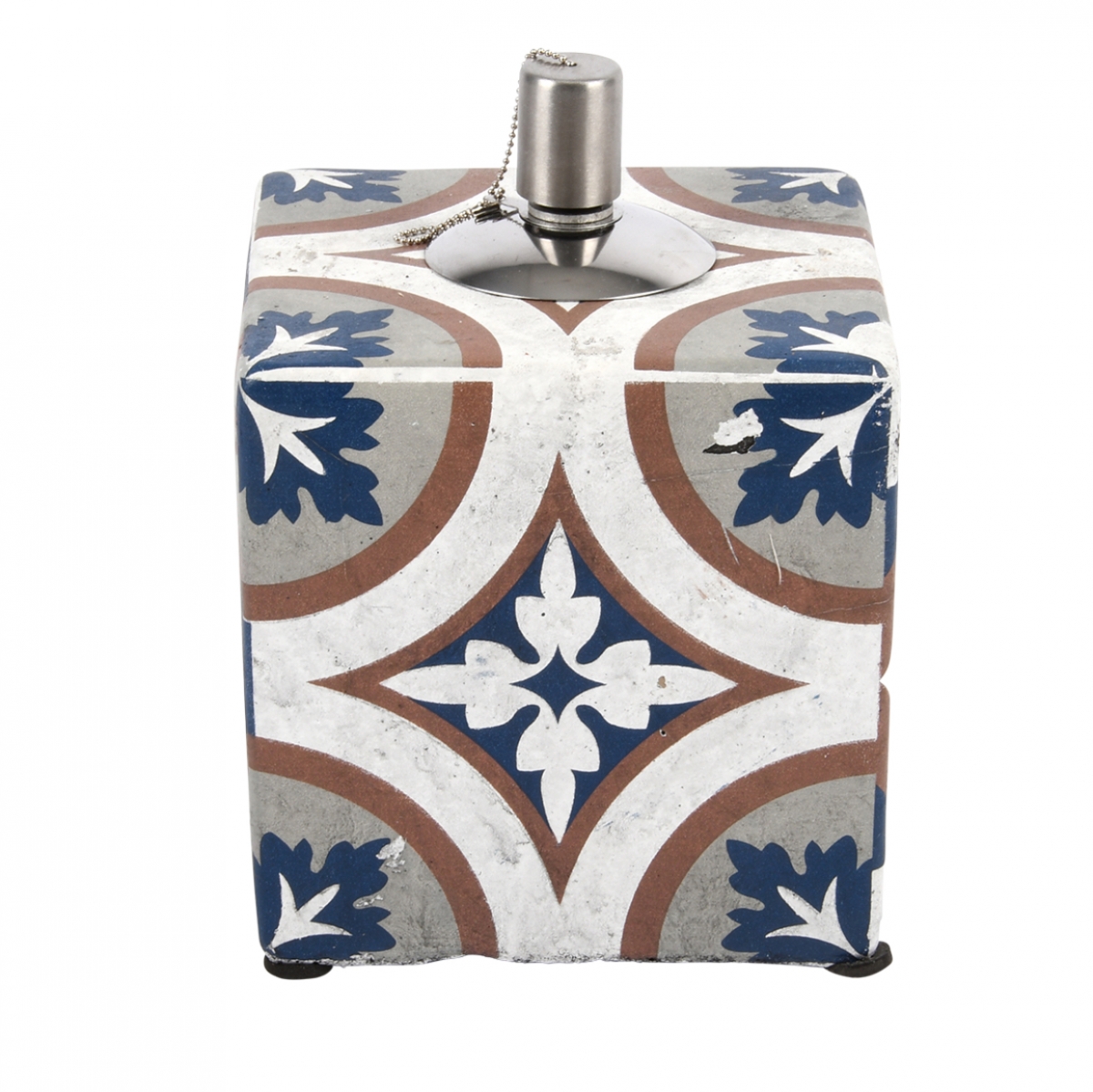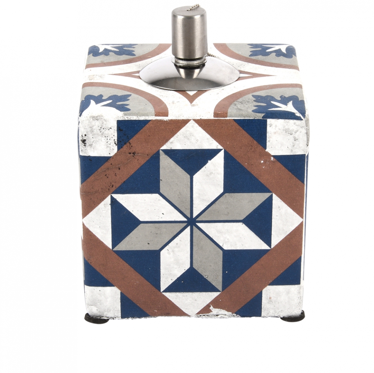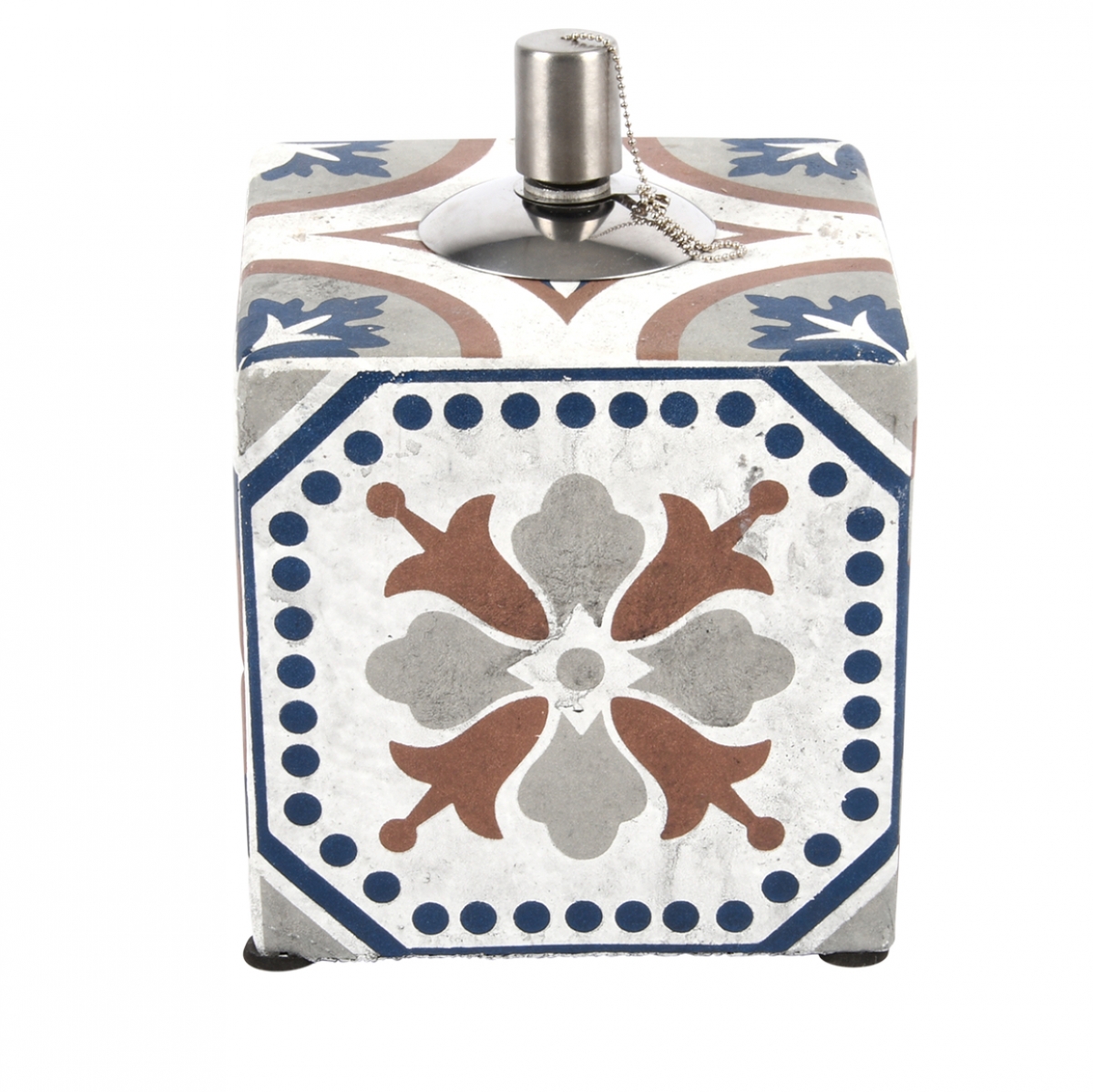 Výrazný dekor, který je inspirovaný portugalskými dlaždicemi, ve spojení s příjemnou kombinací bílé, šedé, hnědé a tmavě modré barvy, v sobě nesou nezaměnitelnou přímořskou atmosféru. Tato olejová lampa je opatřena i krásnou patinou.