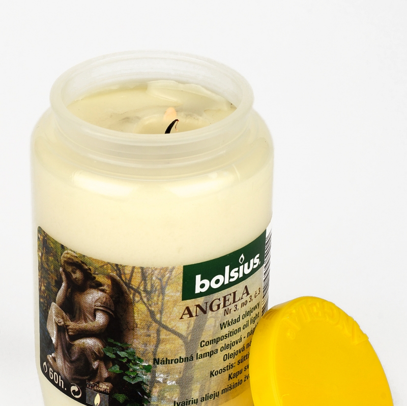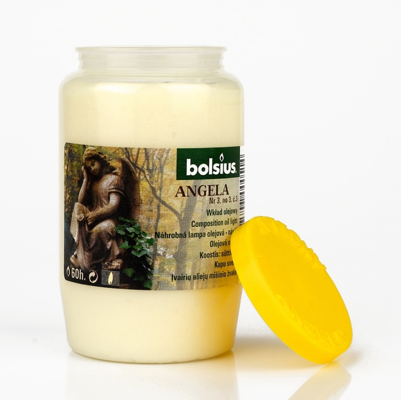 Olejová svíce Angela 60 hodin hoření. Olejová svíce zdobená stylovým motivem s dobou hoření až 60 hodin. Návod na použití: Před použitím odstraňte víčko. Pouze pro venkovní použití, vložte do vhodné nádoby. Pouze pro jednorázové použití.