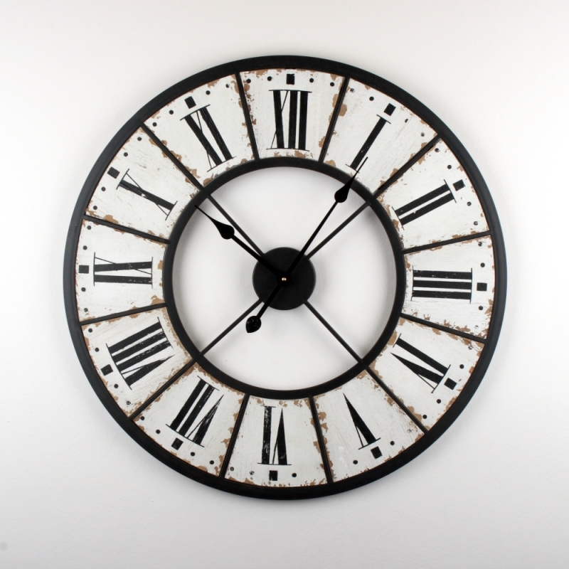 Originální nástěnné hodiny s oprýskaným vzhledem 70cm mají kovový rám a střed ciferníku nemá výplň. Ručičky tak běhají jakoby přímo po stěně.
