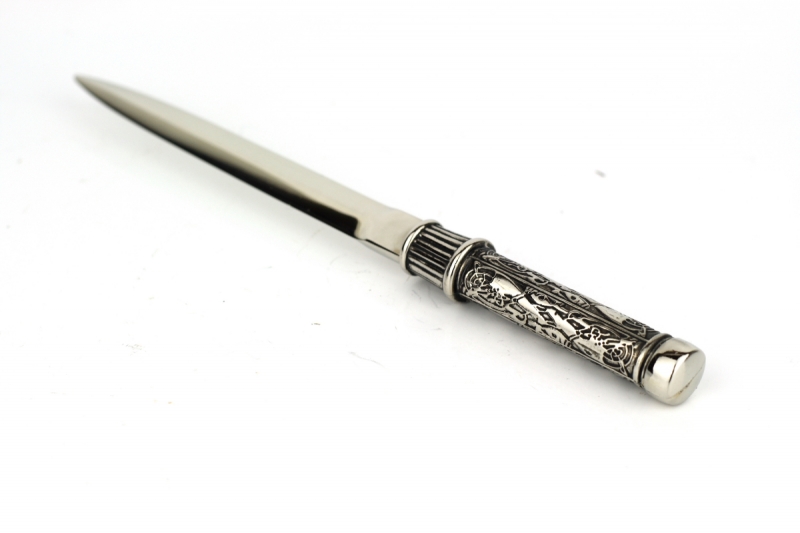 Otvírač na dopisy je postříbřený, má bohatě zdobenou rukojeť.