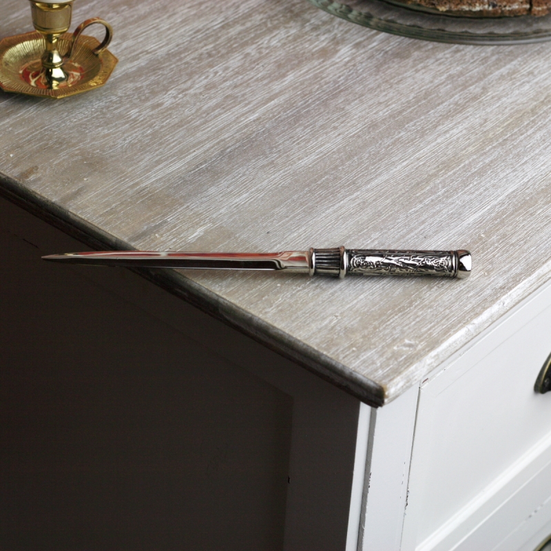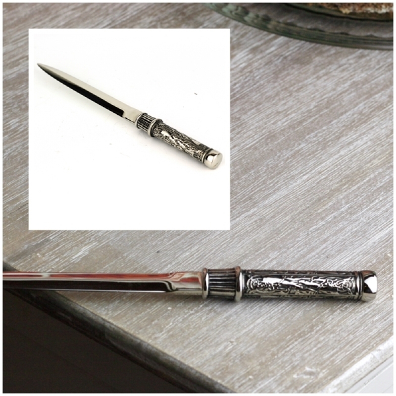 Otvírač na dopisy s ozdobnou rukojetí 20cm je stylovým doplňkem pracovního stolu. Dříve často používaný malý nožík pro snadné otevírání doručené pošty se může stát součástí i Vaší pracovny či kanceláře.