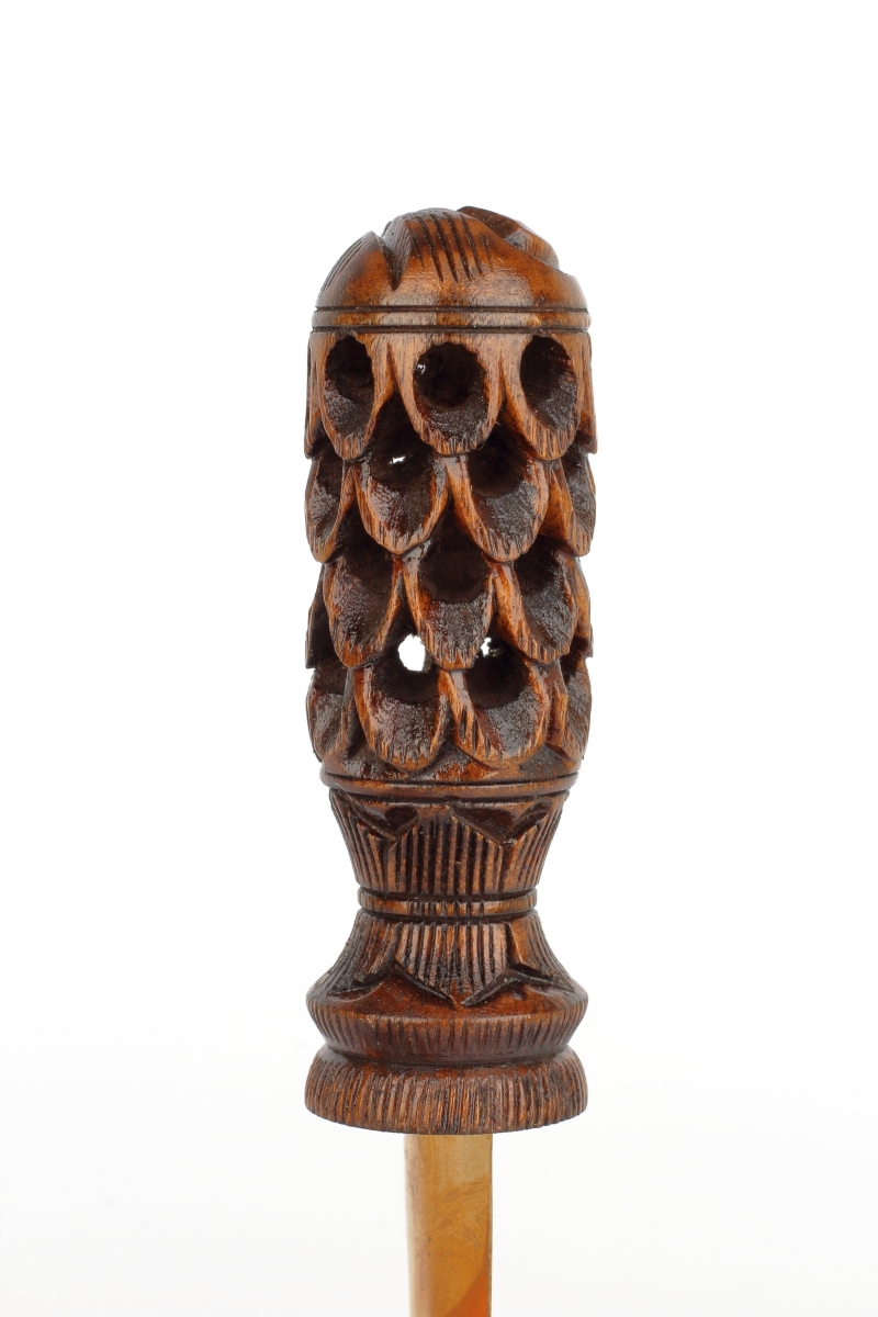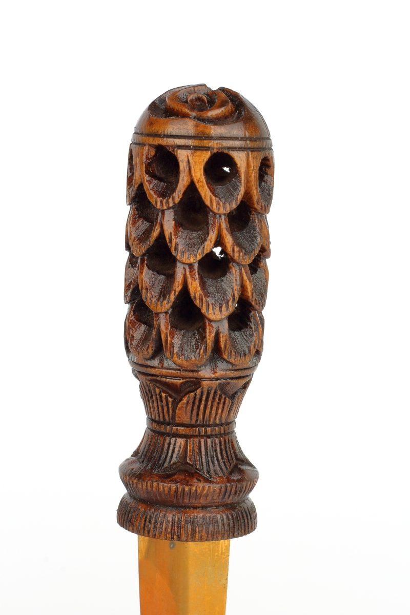 Otvírač/otvírák na dopisy je mosazný s dřevěnou ručeně vyřezávanou rukojetí.