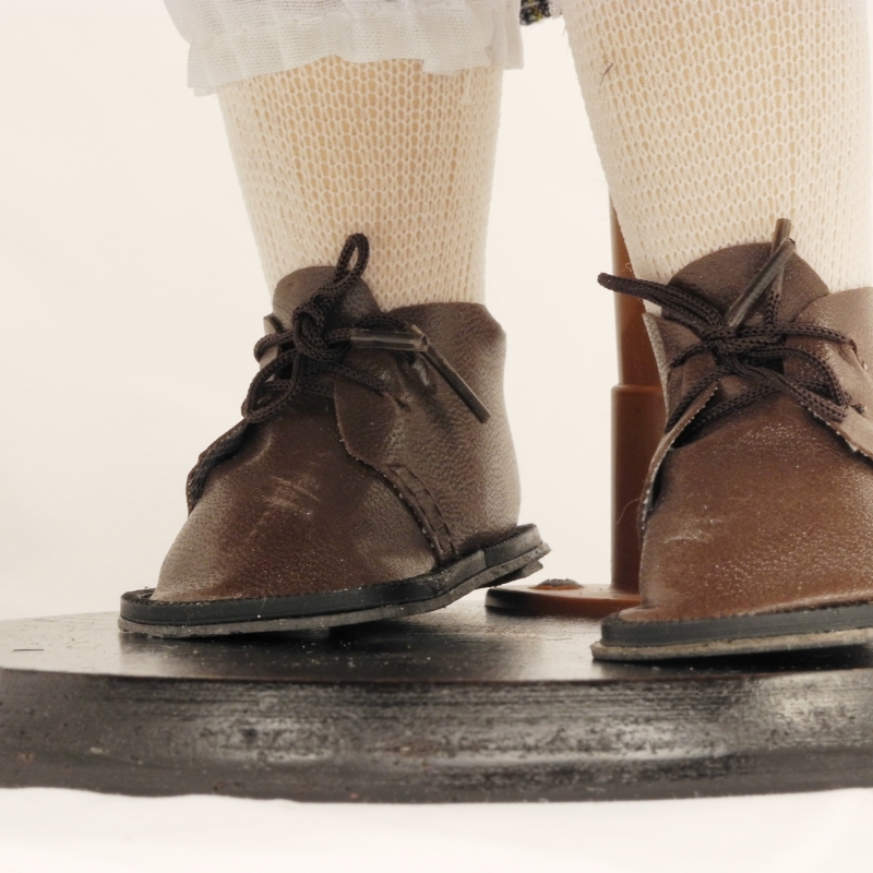 Oblečeny má béžovo oranžové plátěné šaty zdobené hnědo zelenou stuhou. Na nohou má koženkové hnědé botičky na šněrování.