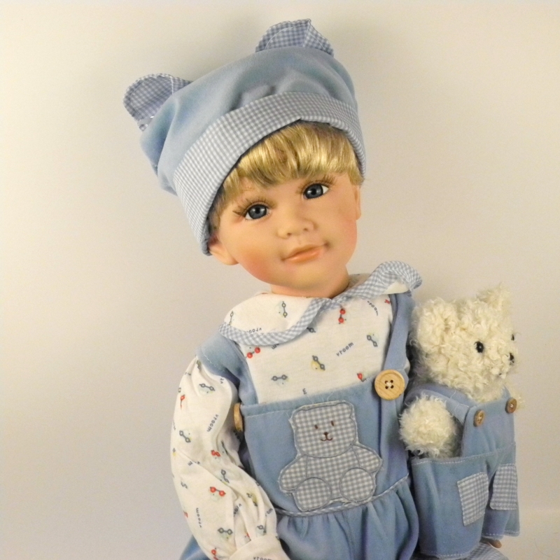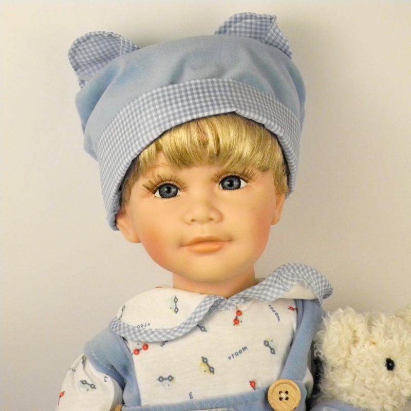 Panenka miminko chlapeček v krásných modrých dupačkách s čepičkou a medvídkem v ruce.