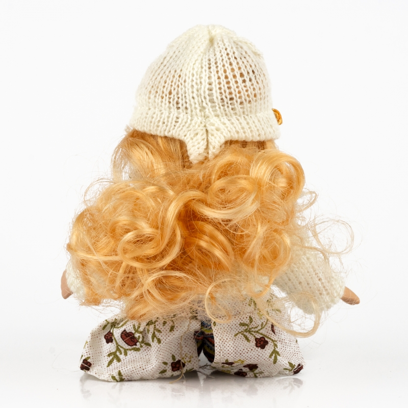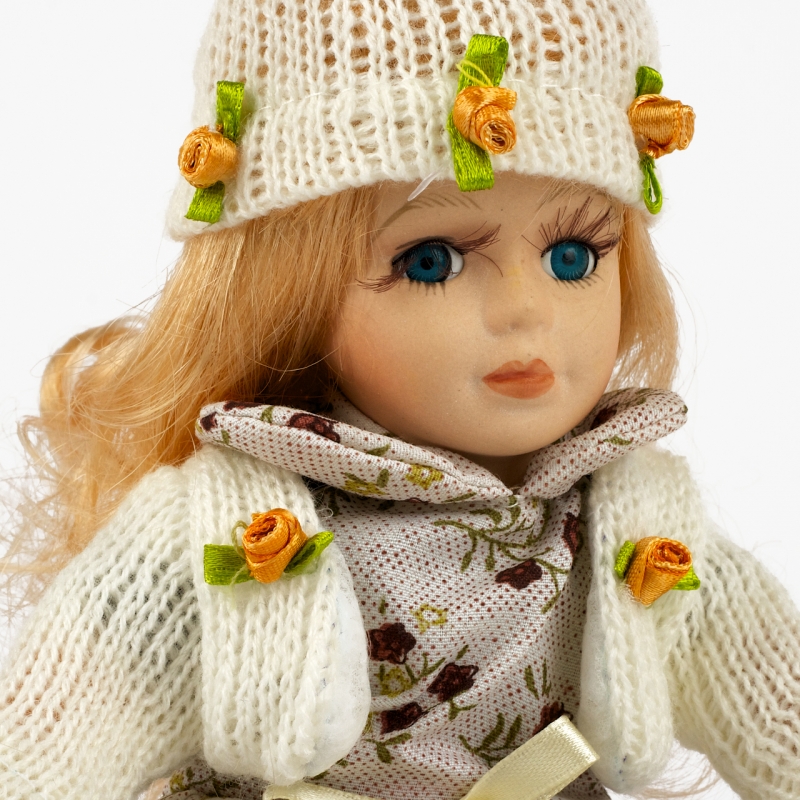 Porcelánová panenka má pruhované kamaše. Doplňkem je bílá pletená čepice, ozdobená růžičkami. Botičky panenky jsou bílé, šněrovací. Obličejové detaily jsou velmi realisticky propracované, dlouhé řasy, modré oči a rozpuštěné blonďaté vlásky. Tělíčko zdobí krátké letní nabírané šatičky.