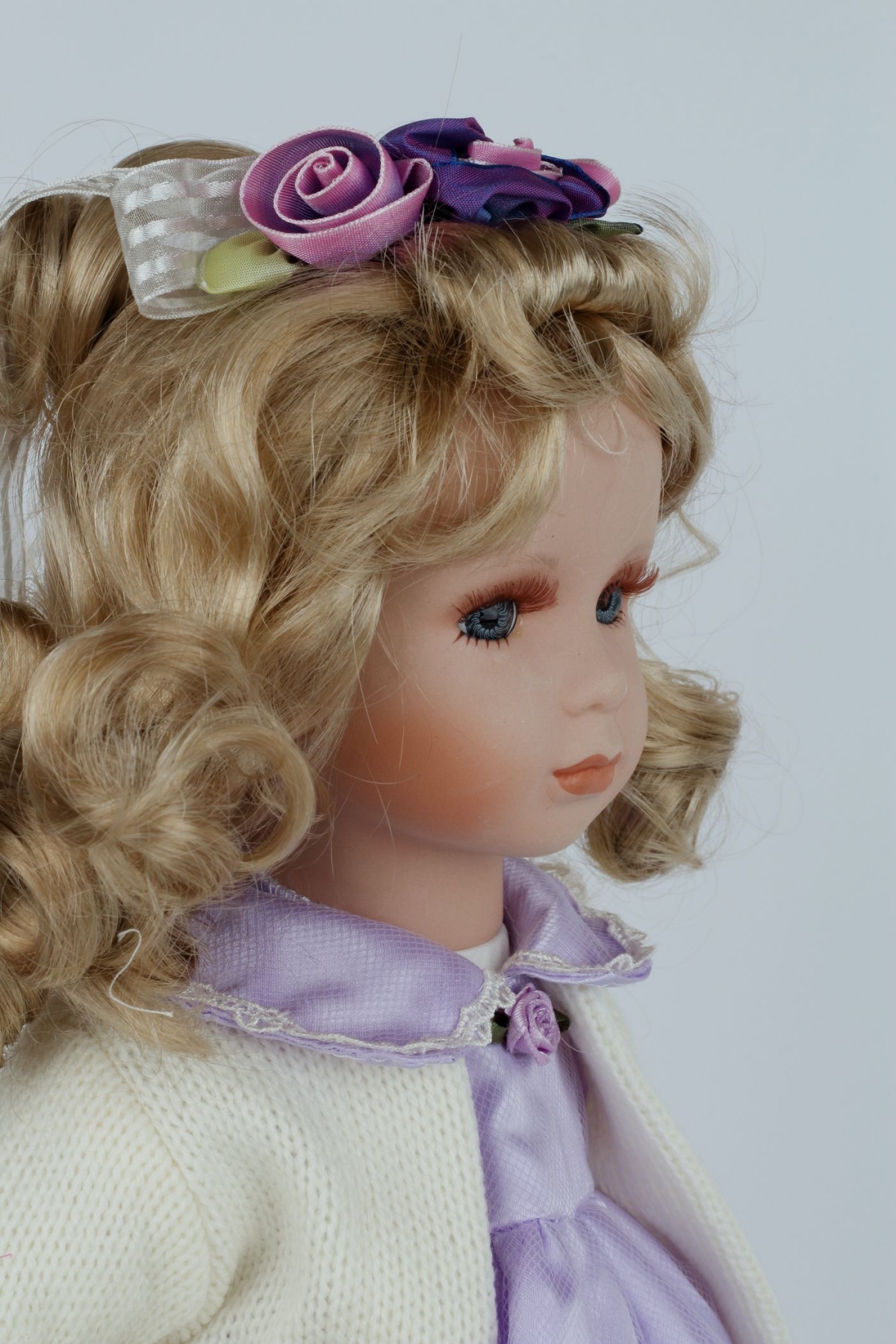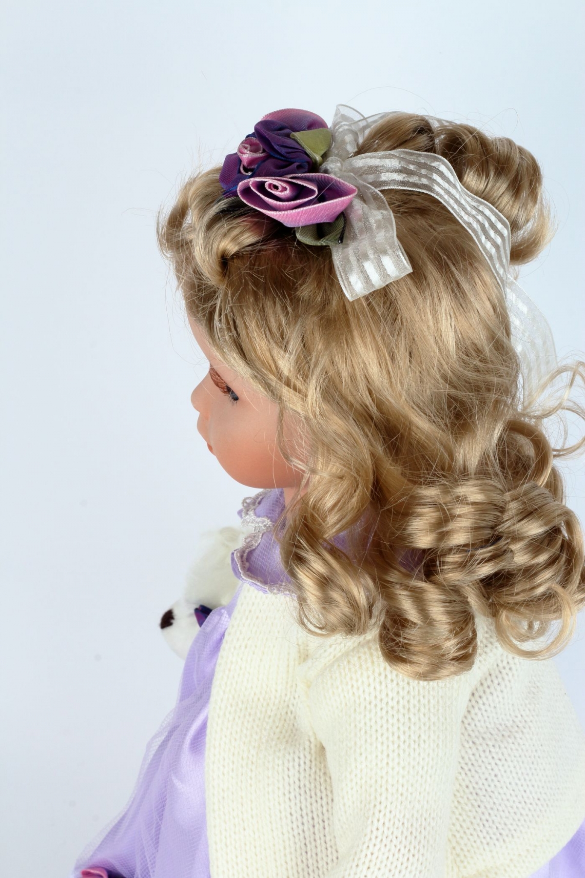 Panenka s porcelánovou hlavou je opravdu kvalitně zpracovaná. Má nádherné světle fialové šaty se spostou krajek s ladícími doplňky - Doubravka má roztomilého plyšového medvěda i krásnou čelenku ve vlasech.