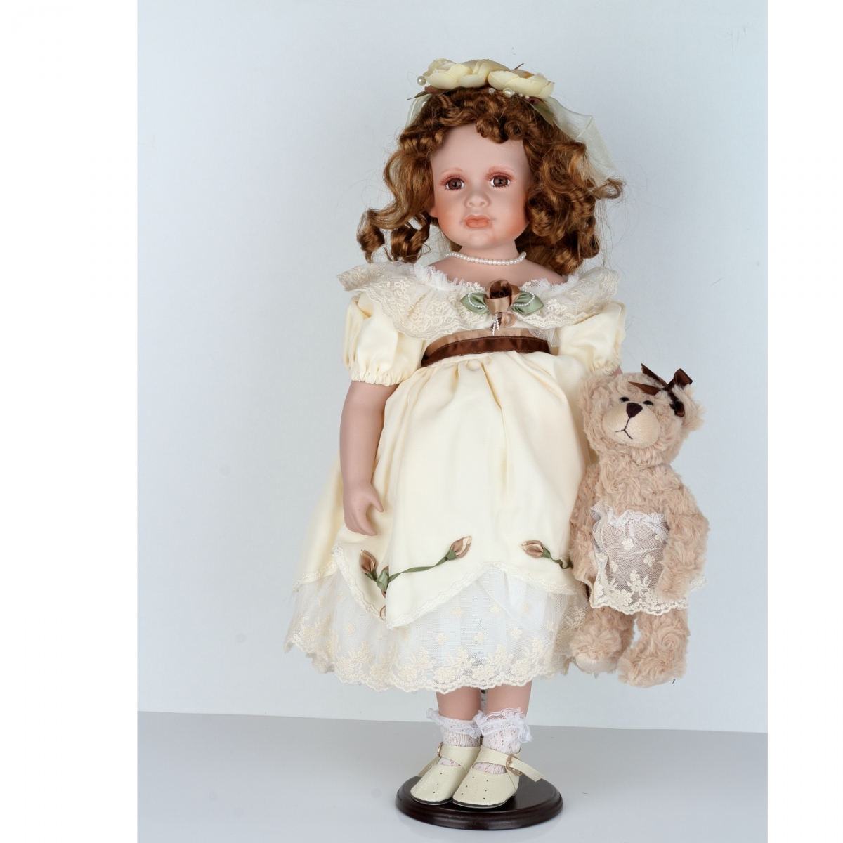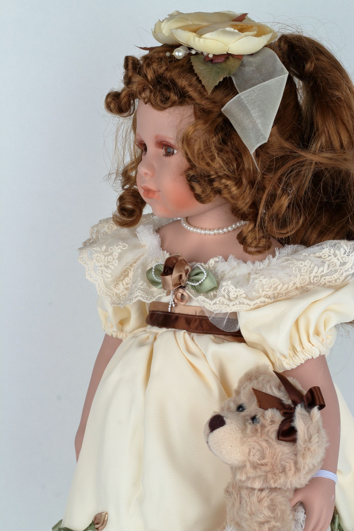 Panenka Sofie má něžné žluté šaty a honosný doplněk v kudrnatých vlasech. Sofie je umístěná na podstavci, takže bude velice snadno stát na svém čestném místě ve vaší sbírce.