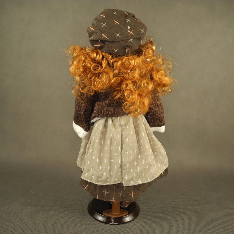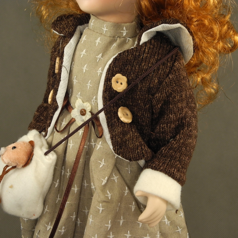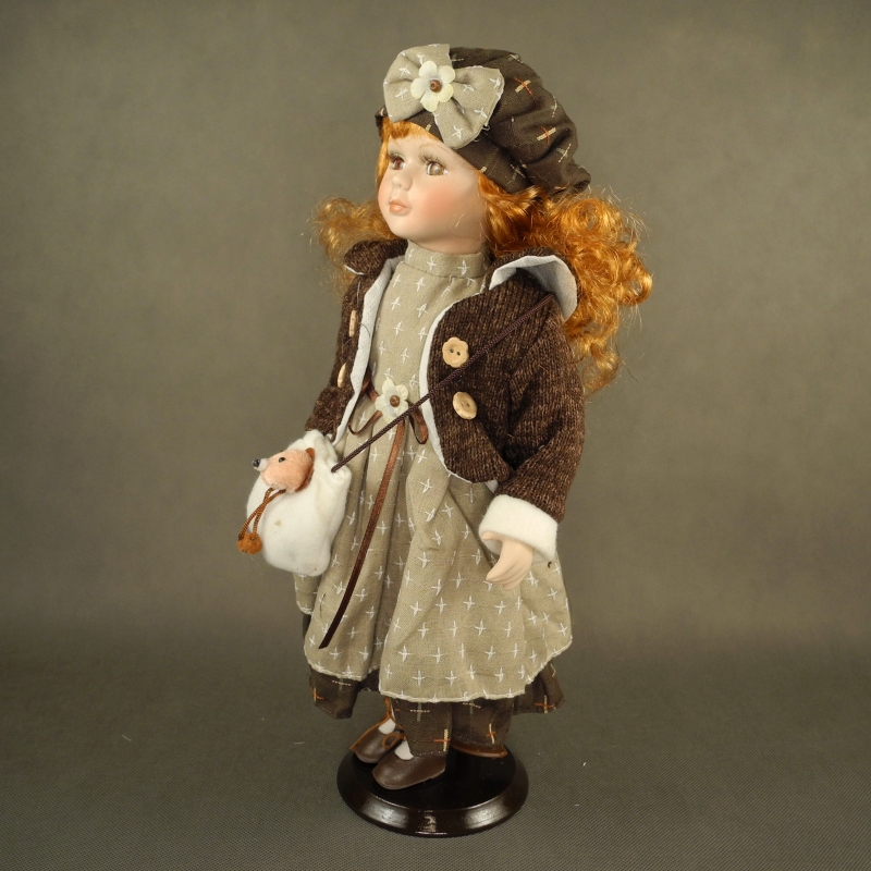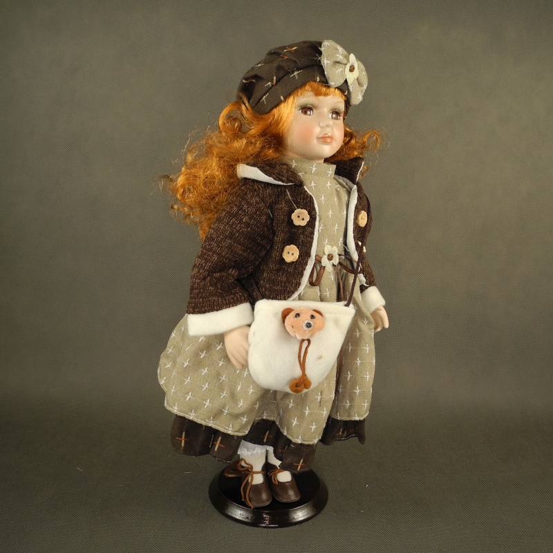 Přes rameno má kabelku s medvídkem. Součástí panenky je tmavý klobouček, dřevěný podstavec a drátěný stojánek.