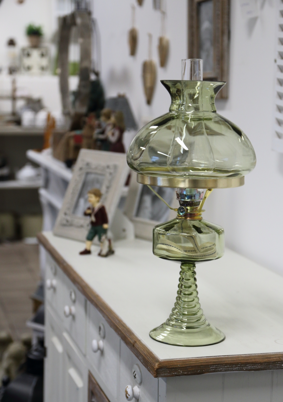 Skleněný podstavec petrolejové lampy, na kterém je umístěn bazének na petrolej ve stejném barevném odstínu zelené, je přímo balzám pro naše oči.