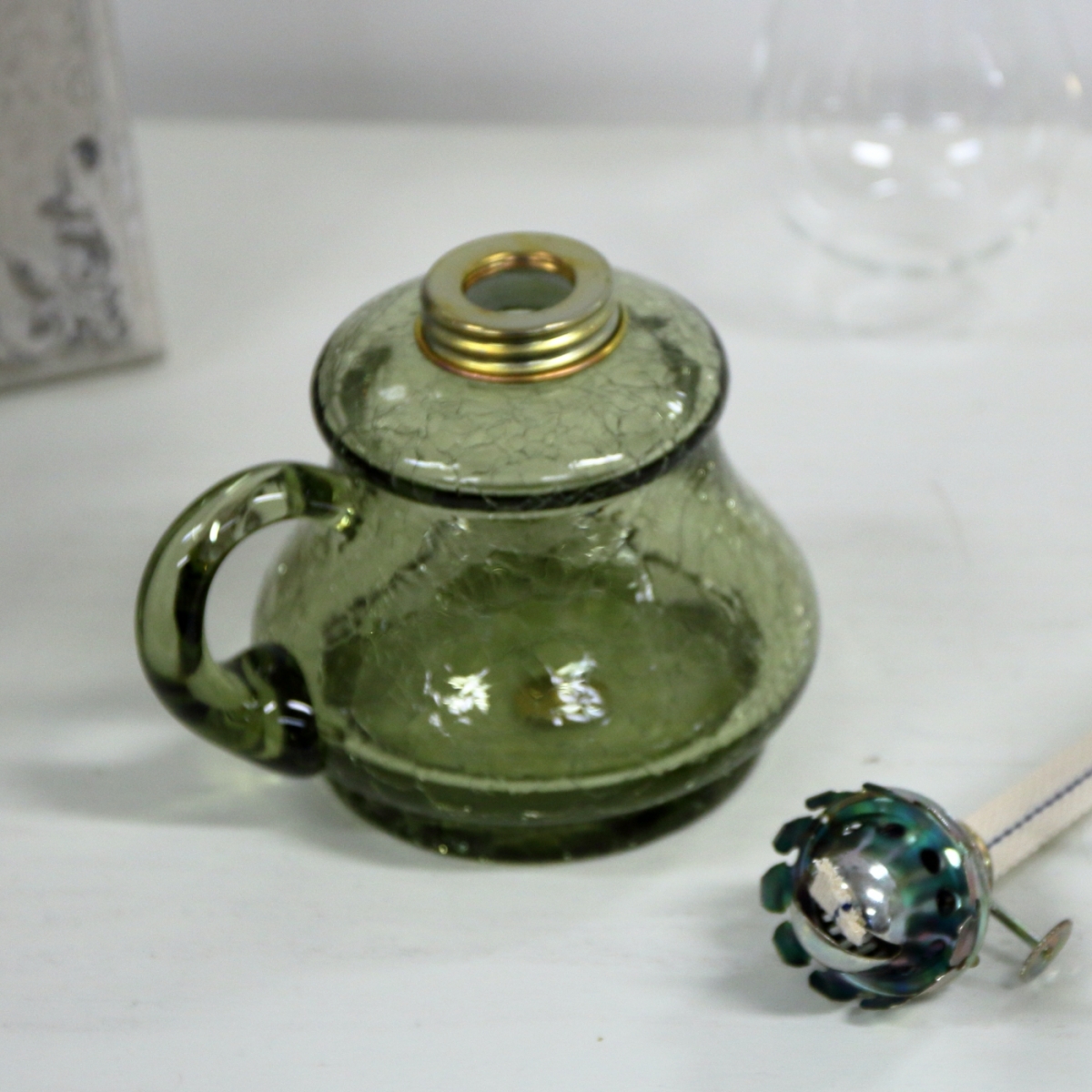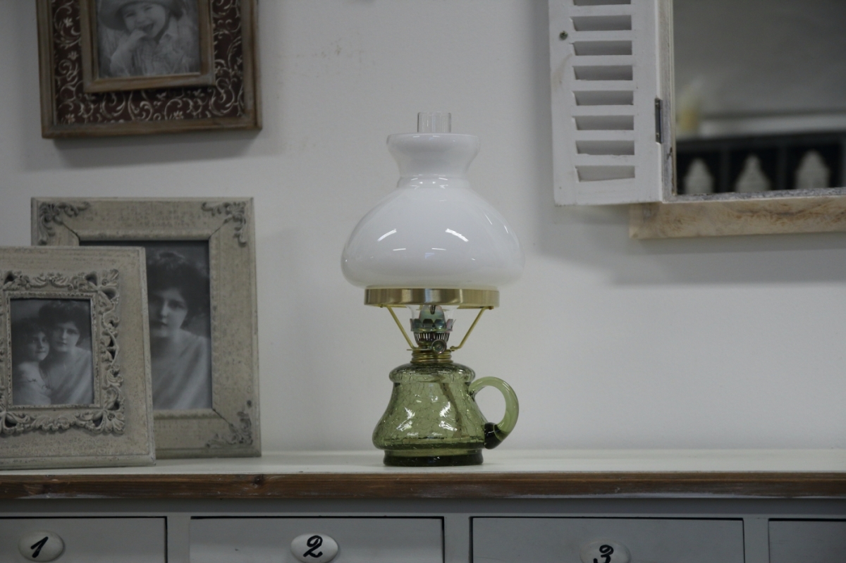 Petrolejová lampa čirá, celoskleněná v příjemném zelinkavém odstínu, s bílým širmem.