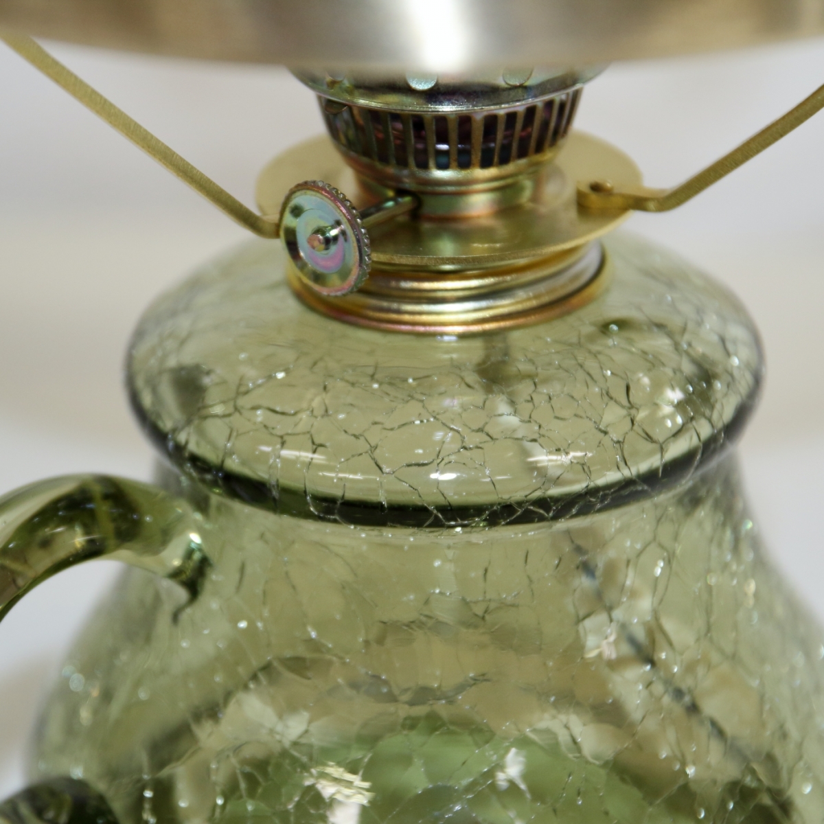 Skleněný podstavec petrolejové lampy ve tvaru nádobky s ouškem, který současně slouží jako bazének na petrolej ve stejném barevném odstínu širmu, je přímo balzám pro naše oči.