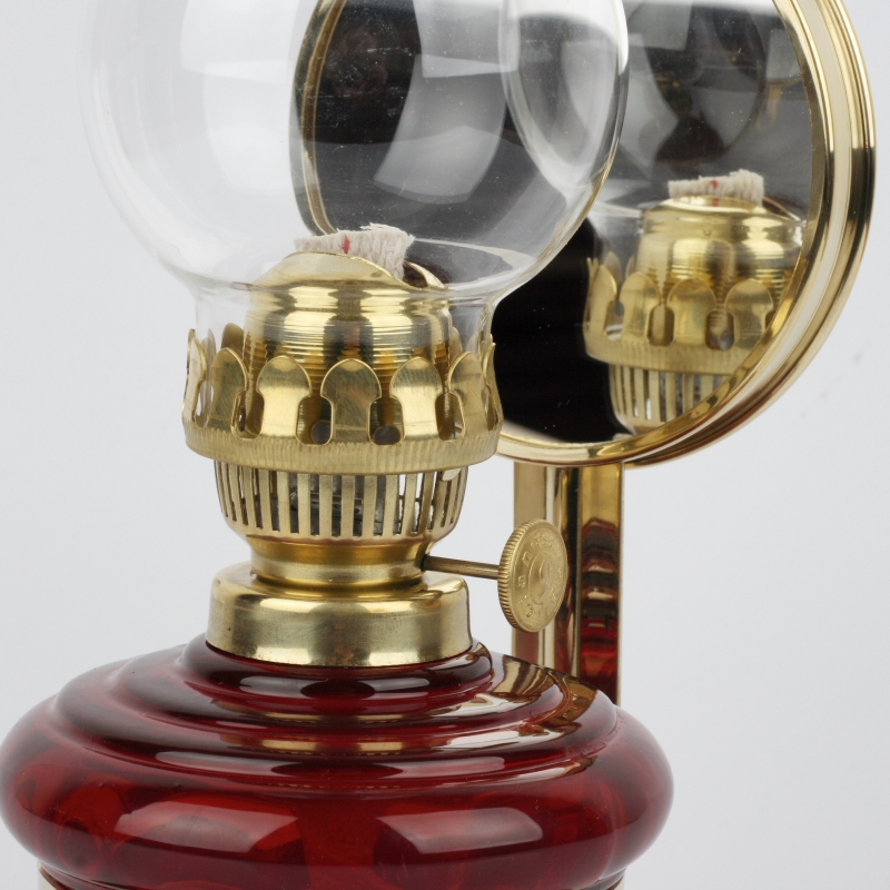 Rám petrolejové lampy je z mosazného plechu, který krásně doplňuje skleněnou nádržku na petrolej ve vínové barvě.