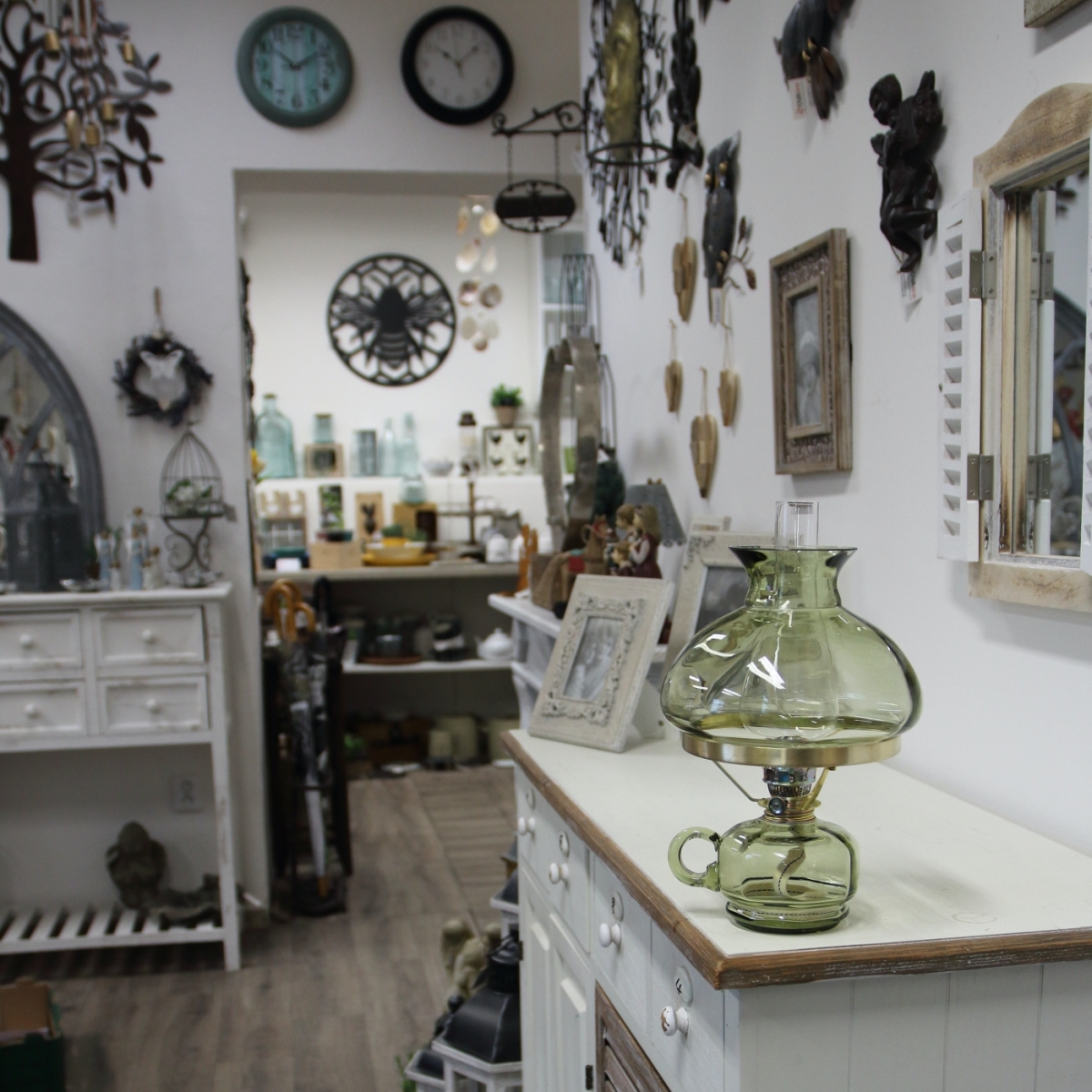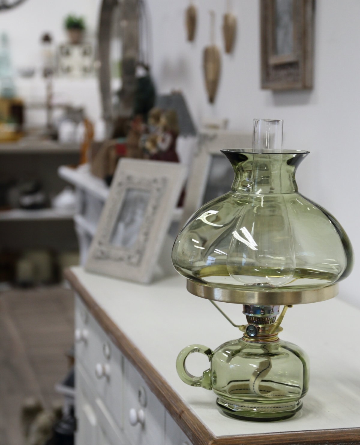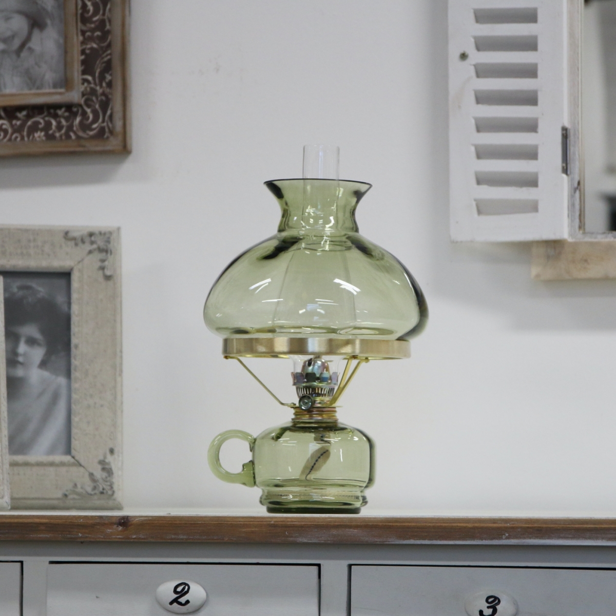 Petrolejová lampa v příjemném zelinkavém odstínu, s cylindrem a zelinkavým stínidlem.