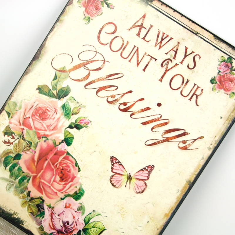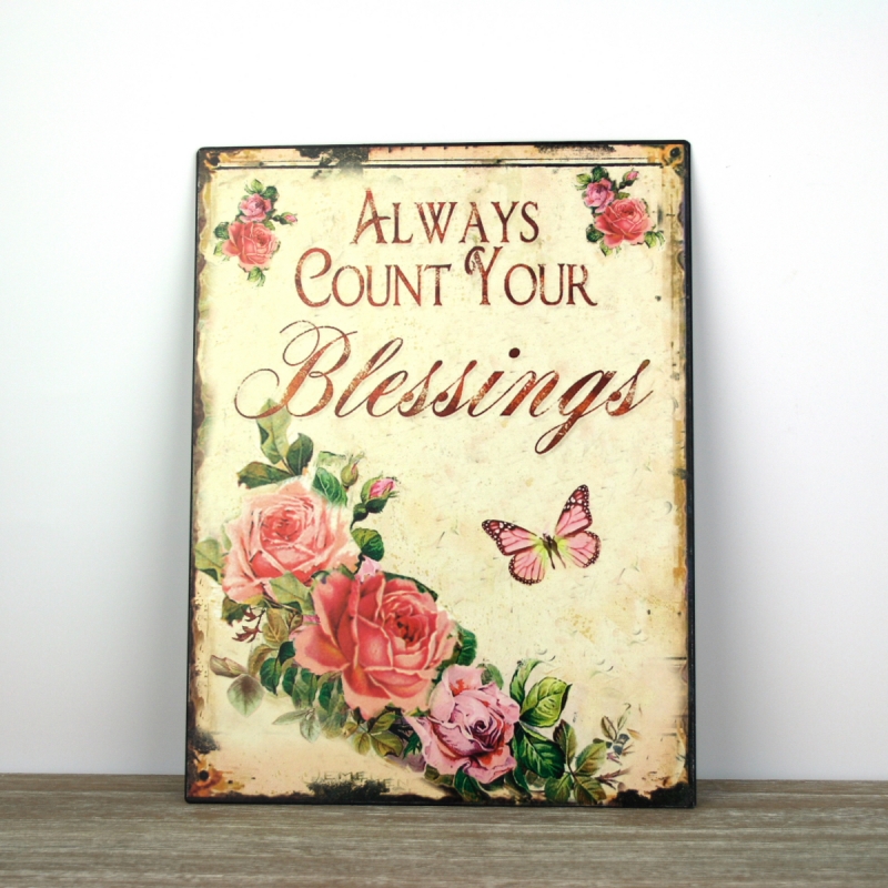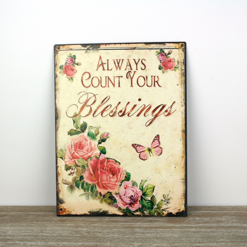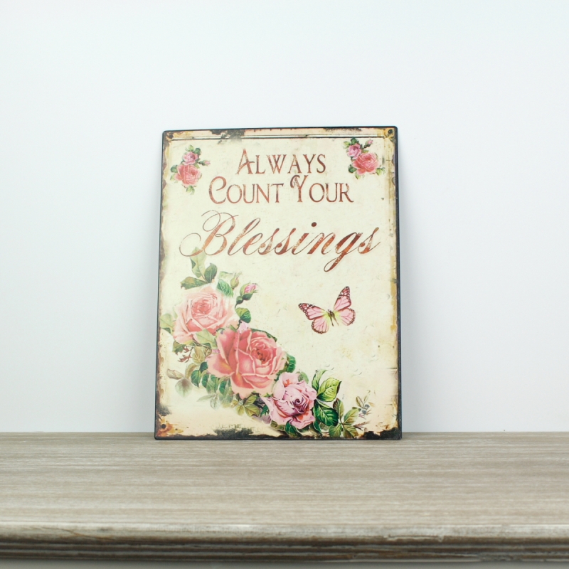 Plechová cedule Blessings 33x25cm ve vintage stylu s motivem překrásných rozkvetlých růží a motýlů.