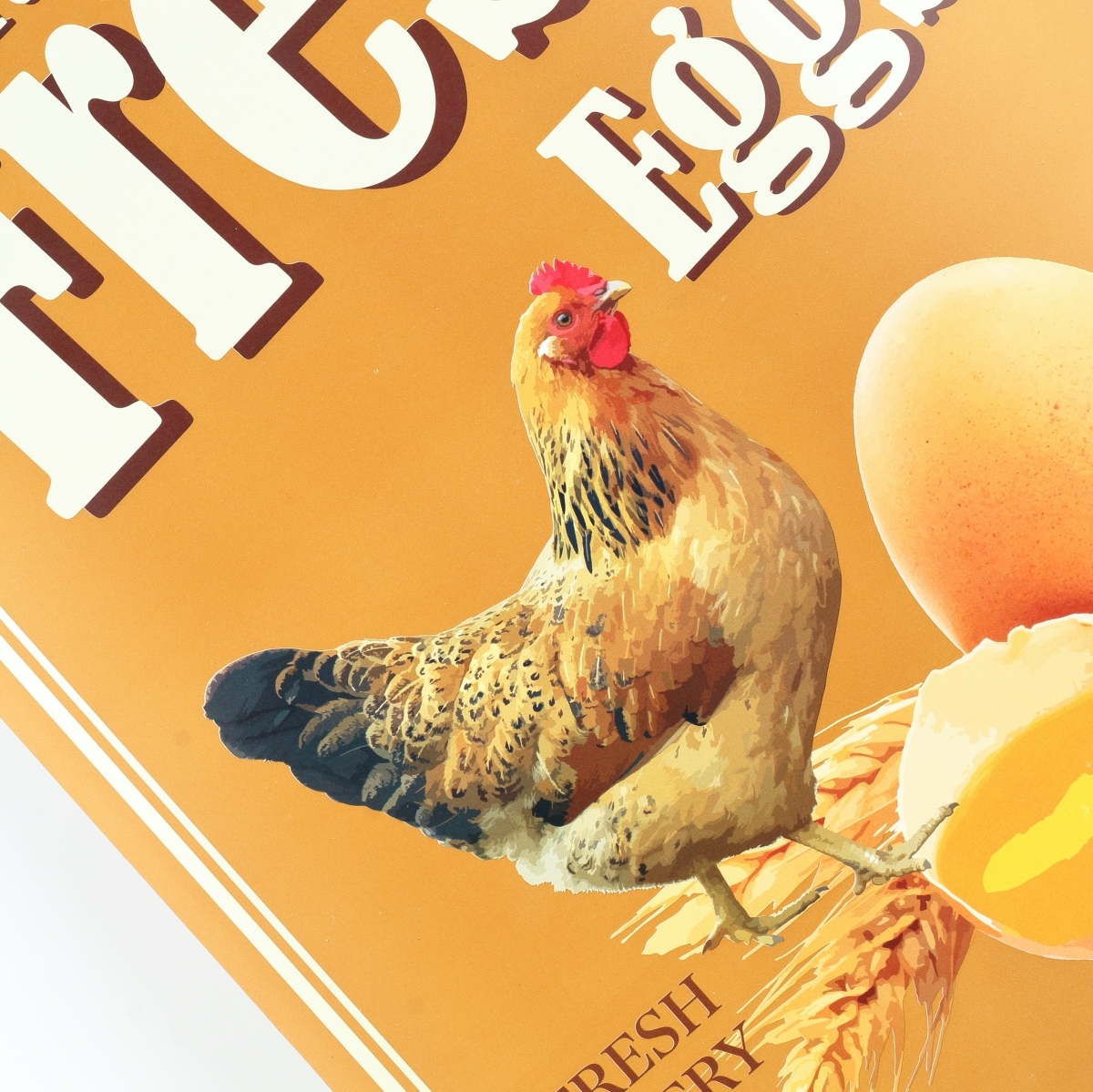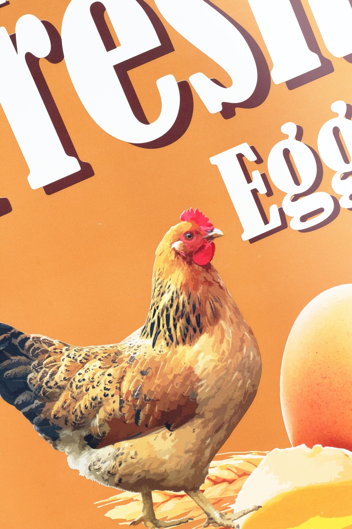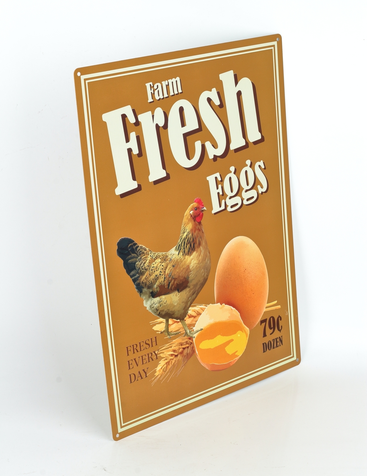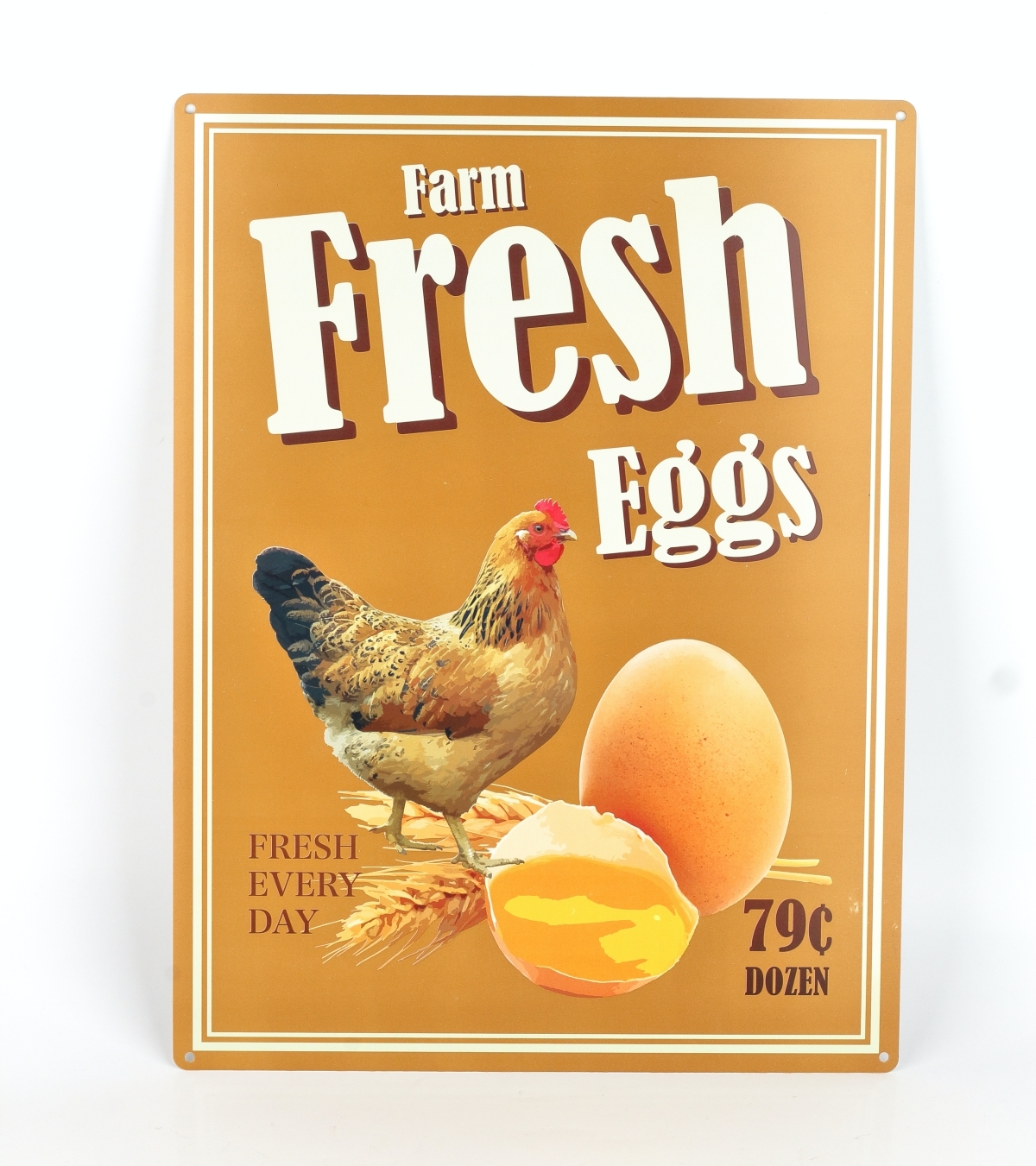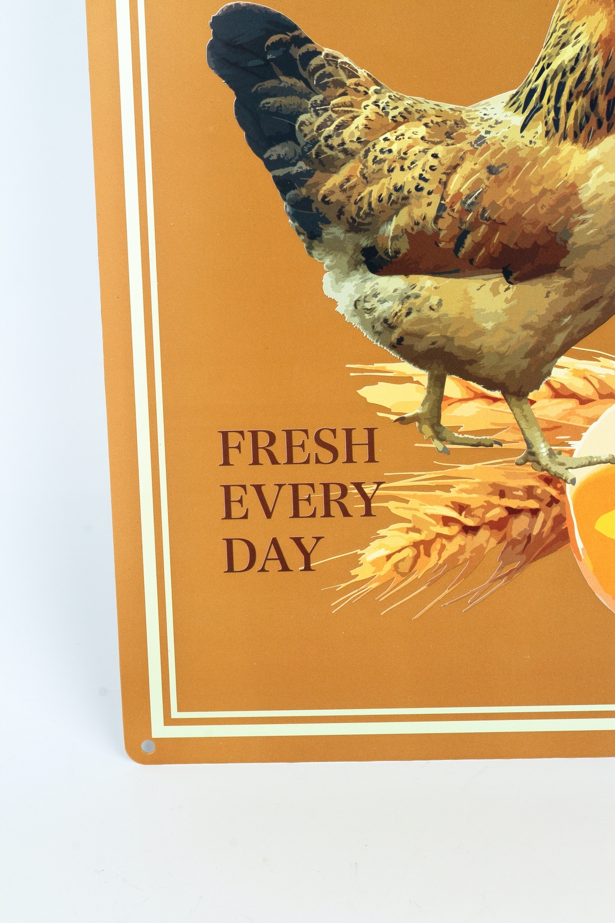 Plechová cedule s motive slepice a nápisem čerstvá vejce. Se 4-mi otvory pro snadné úmístění.