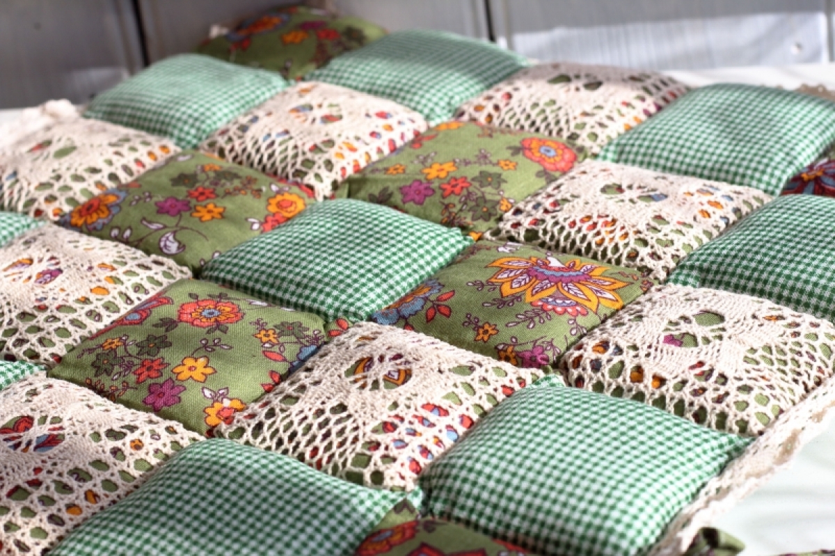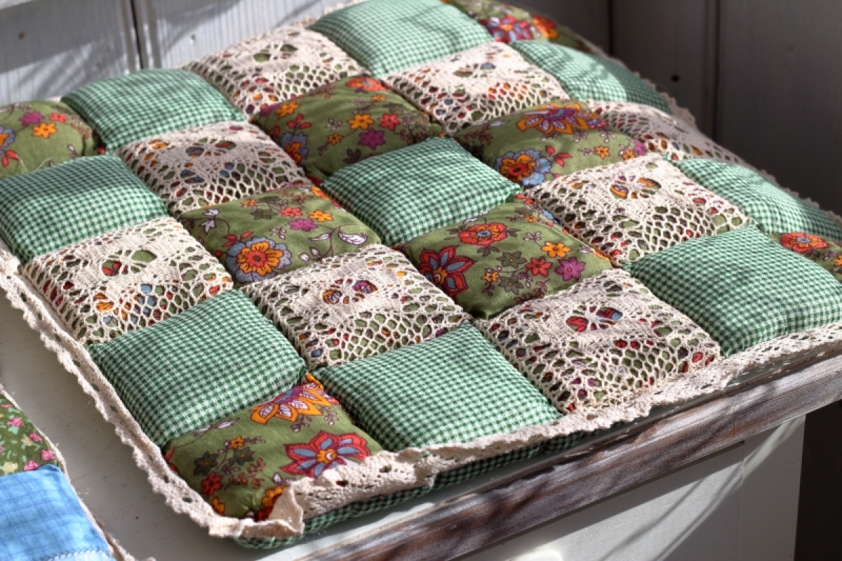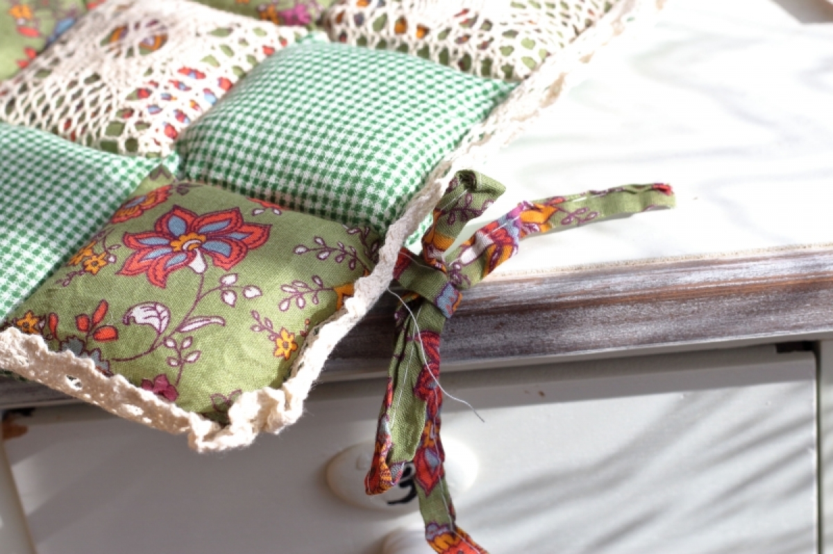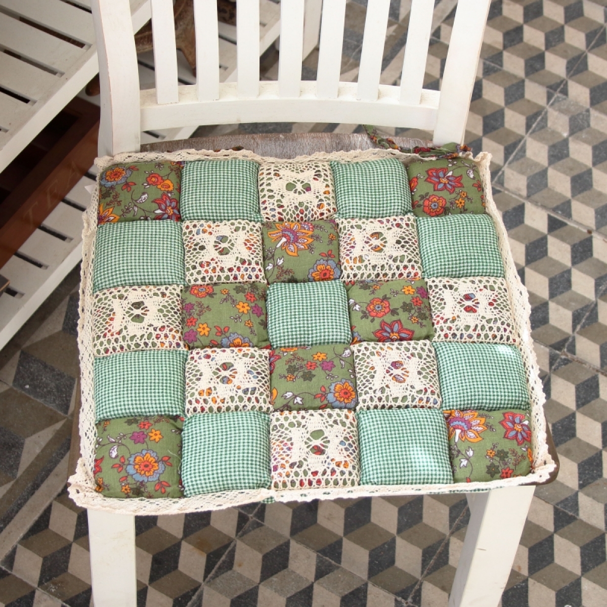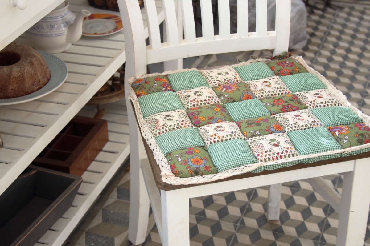 Podsedák na židli zelenkavý 40x40cm v krásném kostkovaném dekoru, bude slušet každé, nejen venkovské, kuchyni.