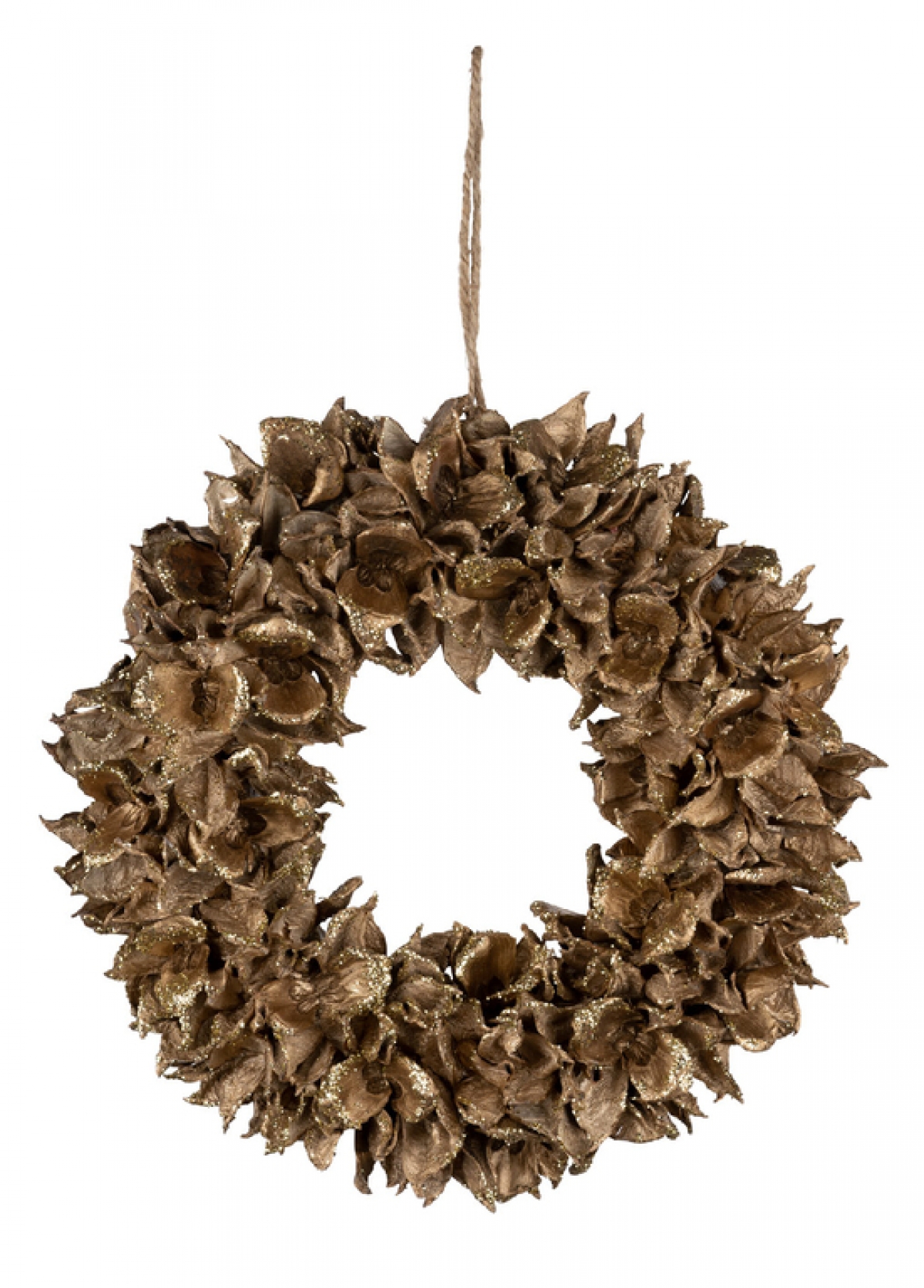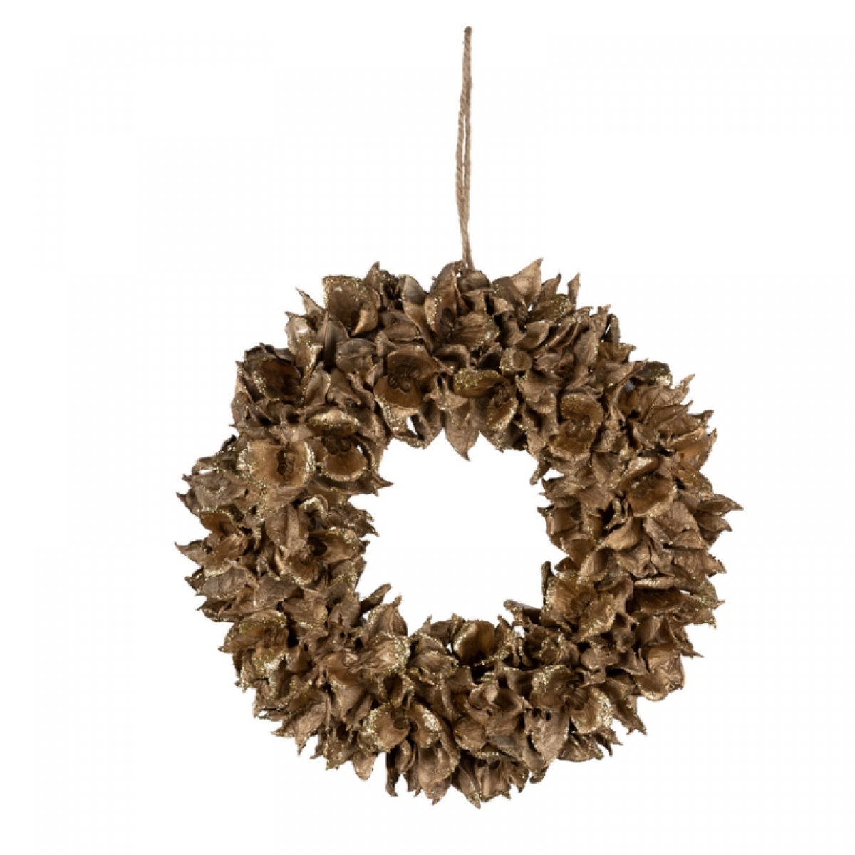 Podzimní dekorace na dveře ve tvaru věnce ze zlacených šiškových šupin je určena pro zavěšení na vchodové dveře, branku nebo do okna. Tento přírodní věnec můžete využít i jako dušičkové aranžmá na hrob nebo jako vánoční dekorace na hrob, kdy na věnec můžete pomocí tavné pistole přilepit malé baňky a umělé květy vánoční růže.