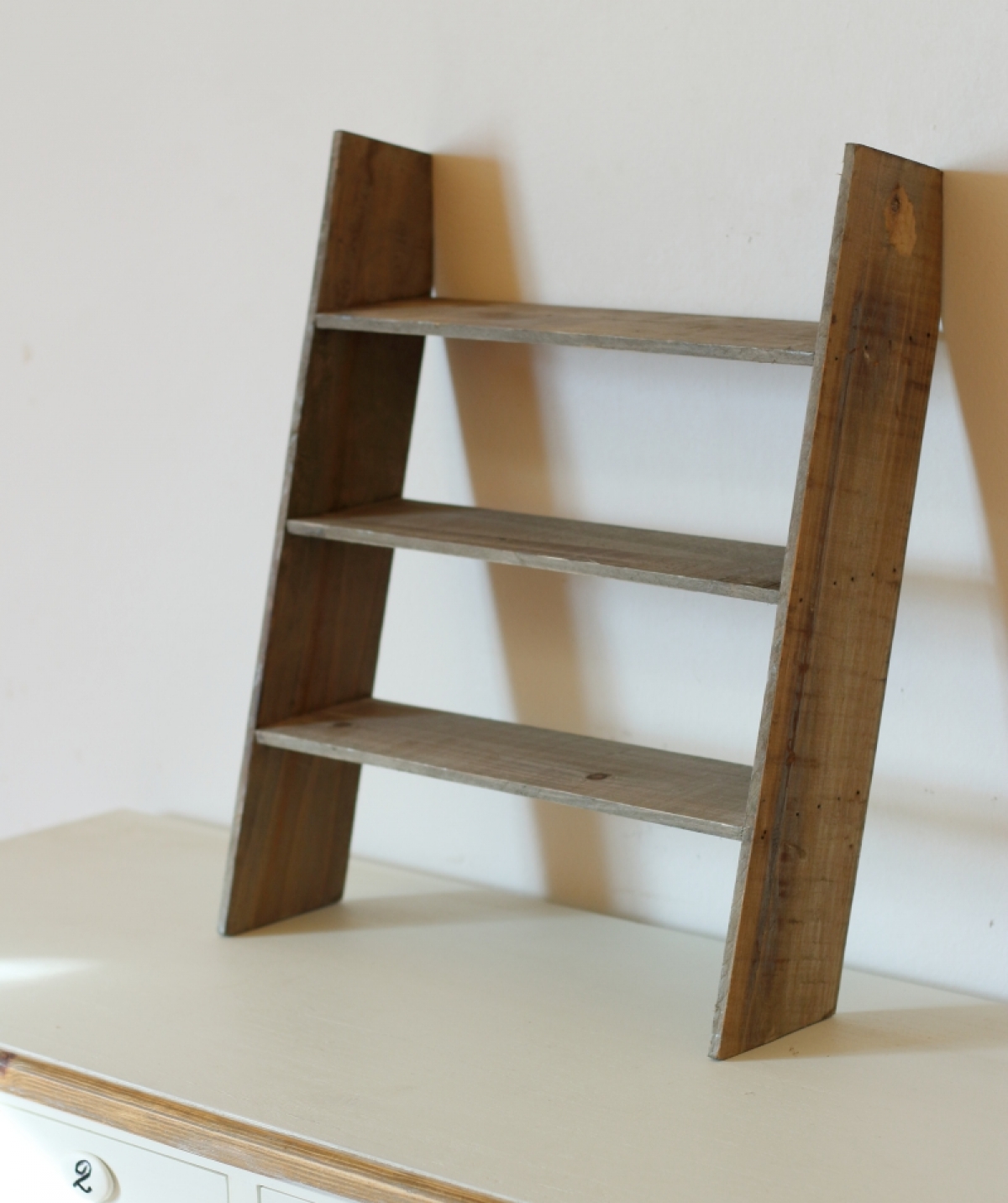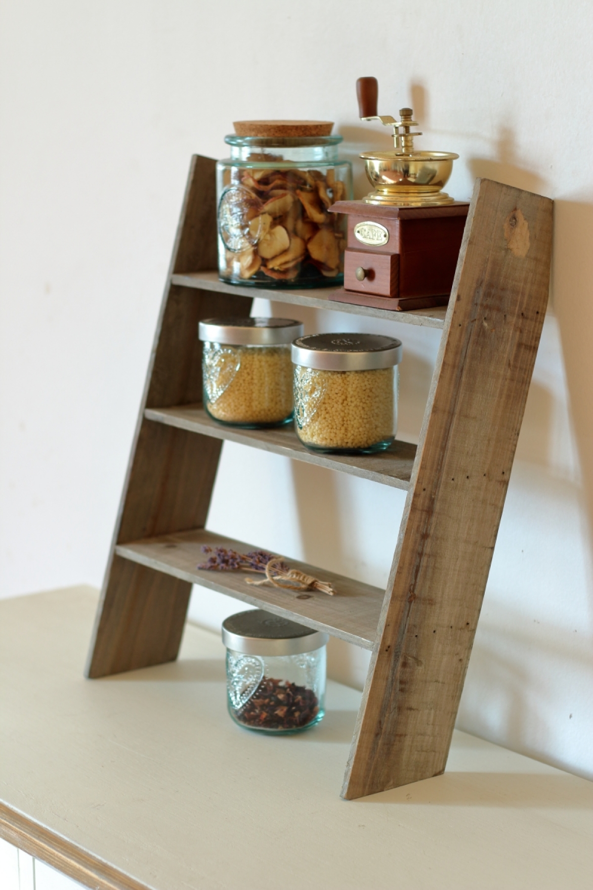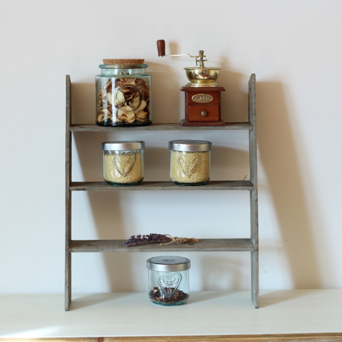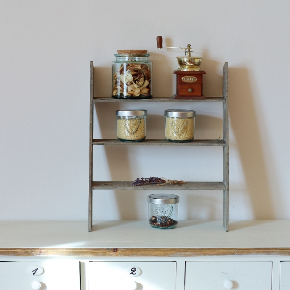 Vintage polica do kuchyne je určená k opření o stěnu, např. o zádovou desku kuchyňské linky.
