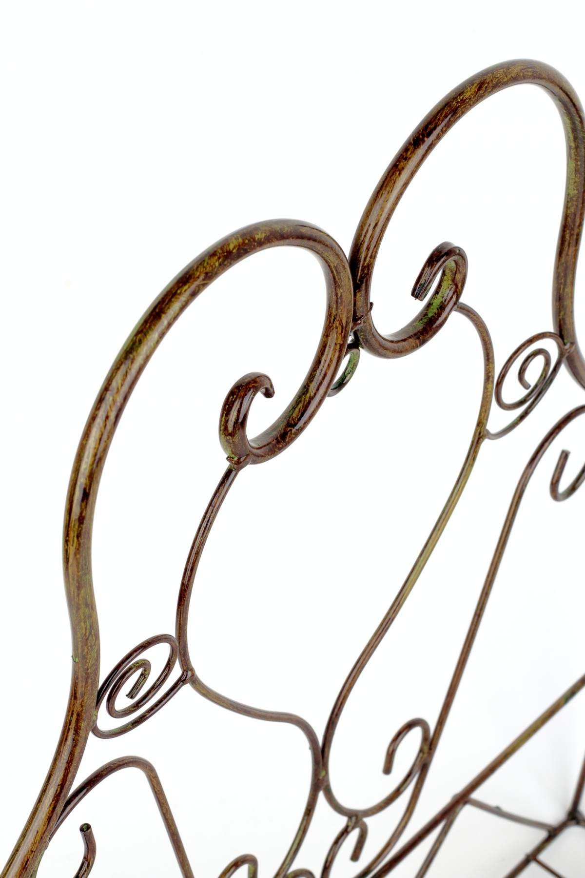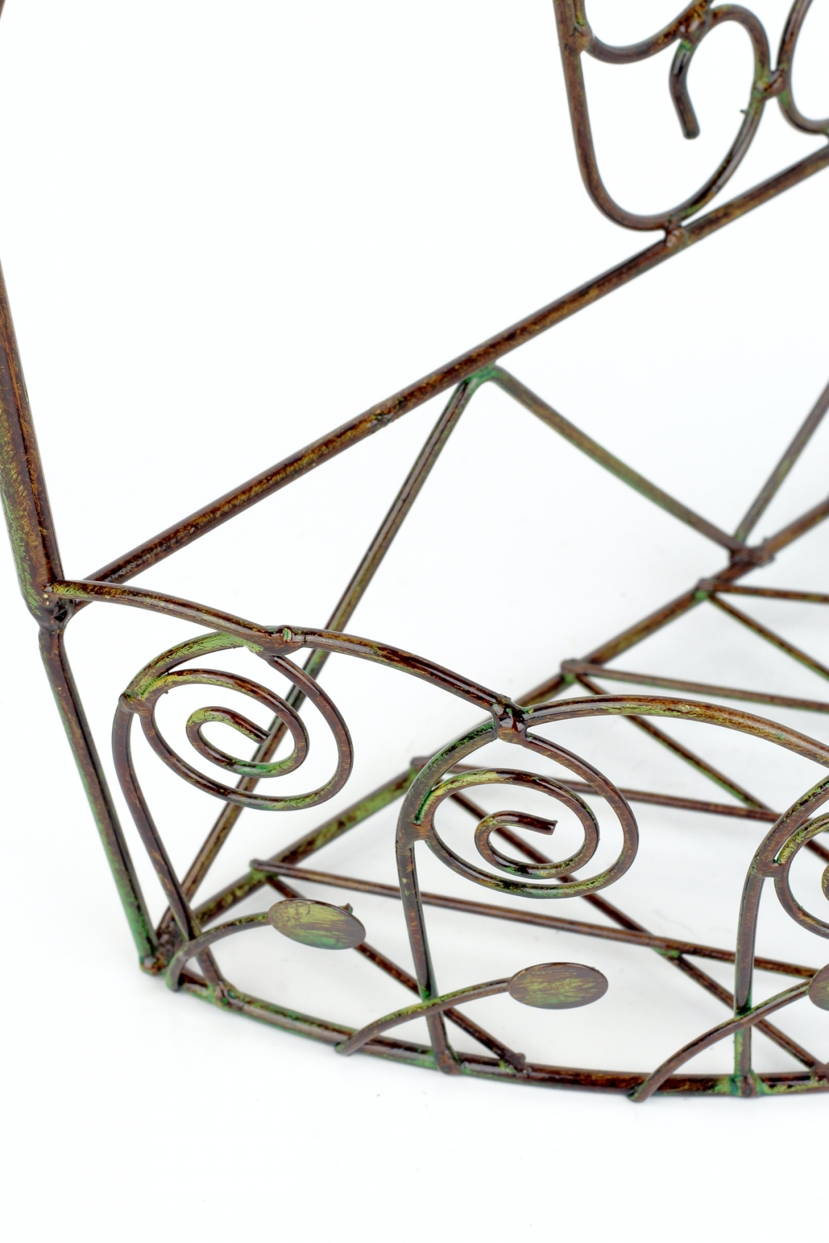 Zelená patina na povrchu poliček na zeď skvěle navodí romantickou atmosféru kvetoucích kytek, které jsou v ní umístěné.