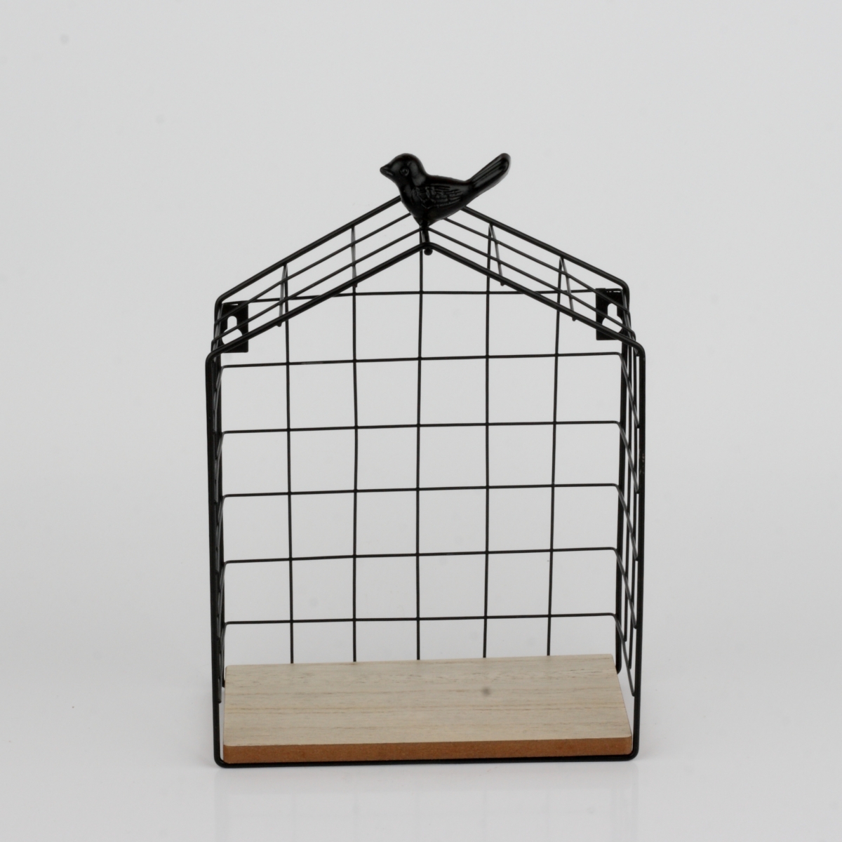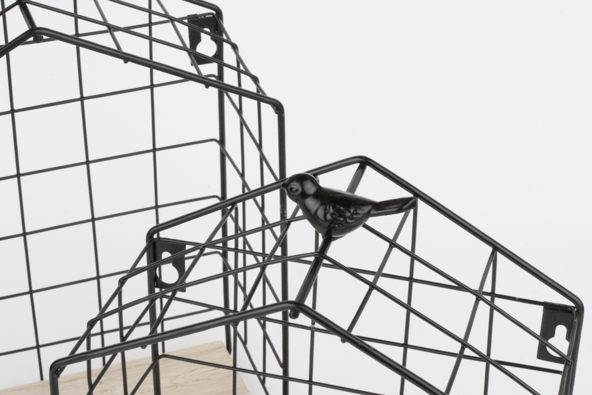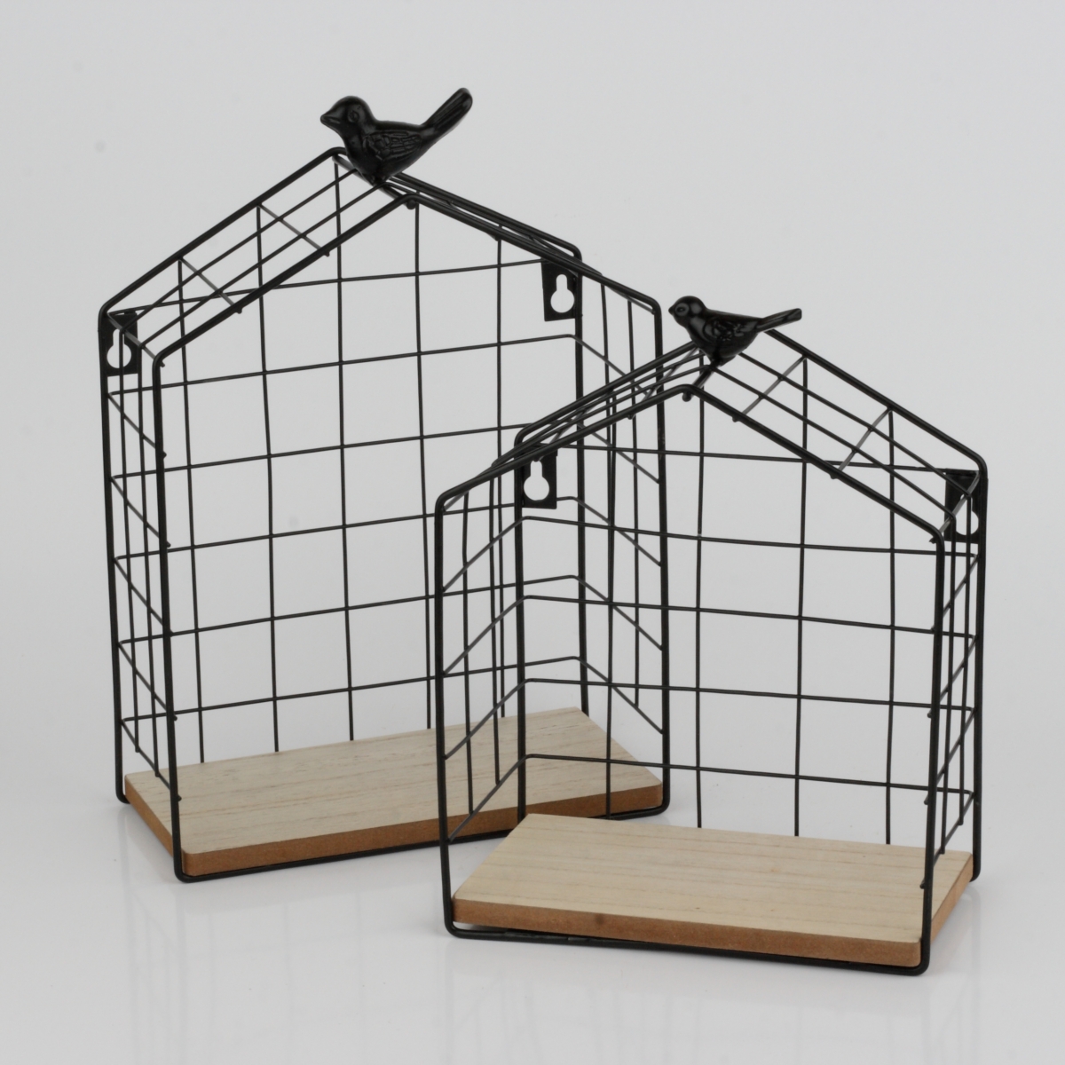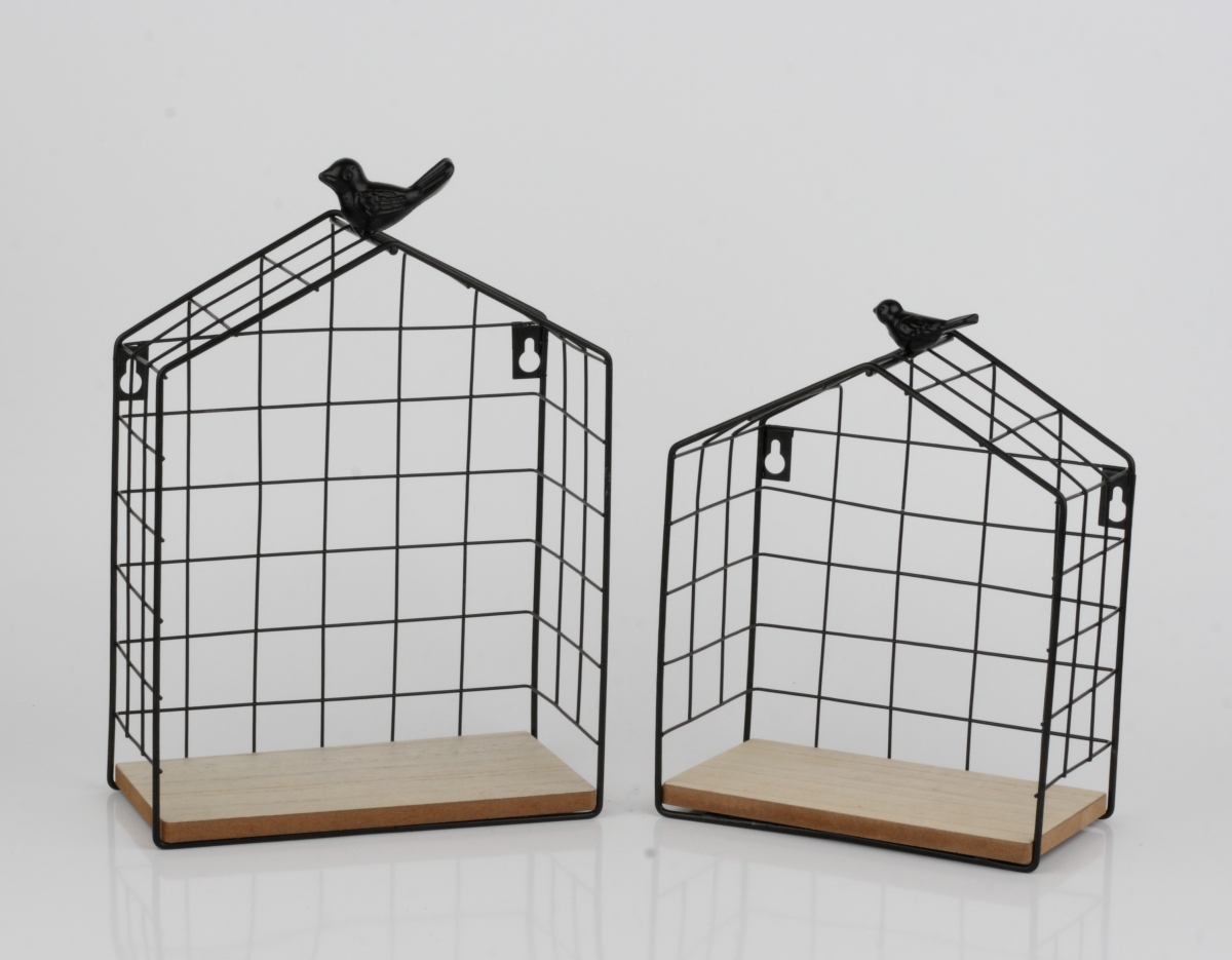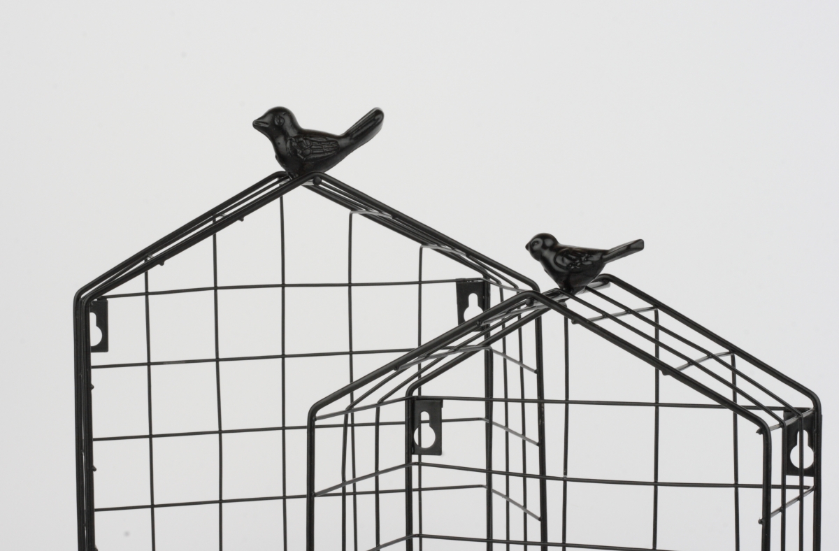 Poličky ve tvaru domečku s ptáčkem (sada 2ks) slouží jako úžasná dekorace prázdných stěn. Kovovou klícku nad každou poličkou zdobí malý ptáček.