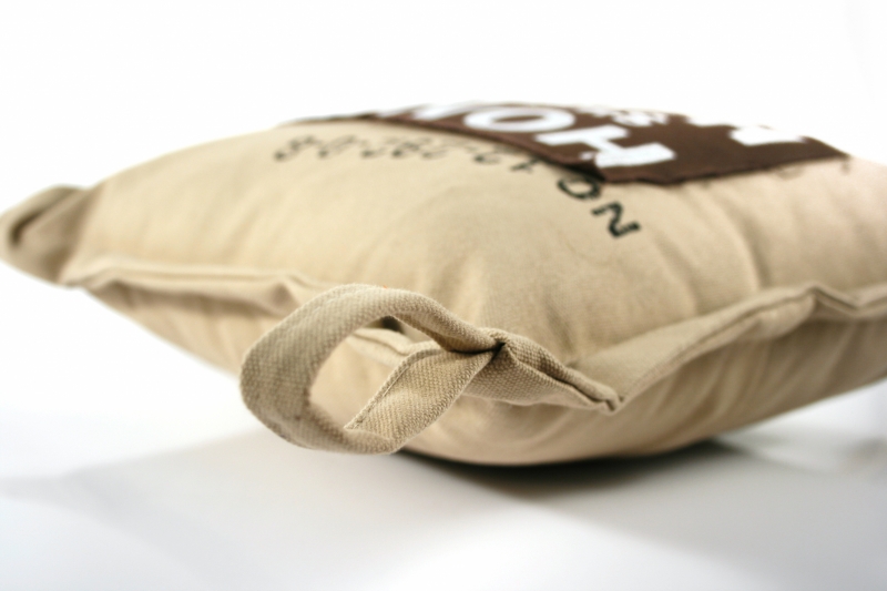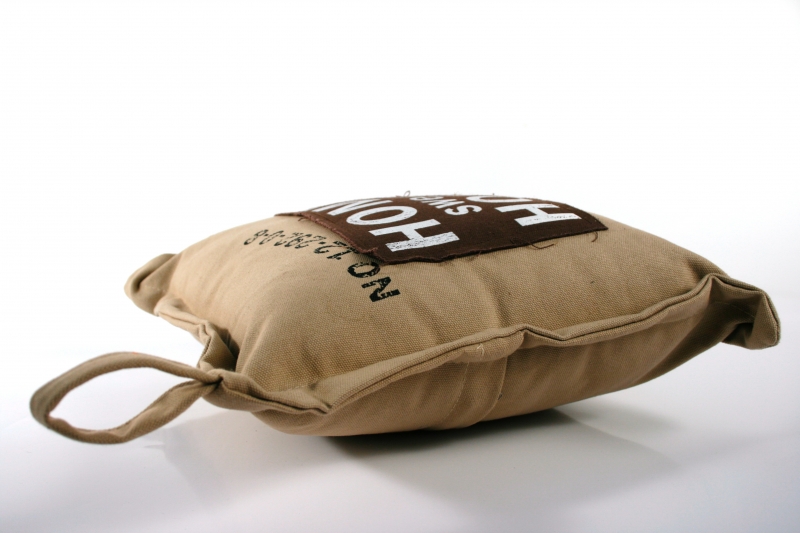 Polštář Home je vyroben z měkké a příjemné látky. Jeho béžové a hnědé tóny oživené nápisy v bílé barvě se budou hodit do jakéhokoli interiéru.