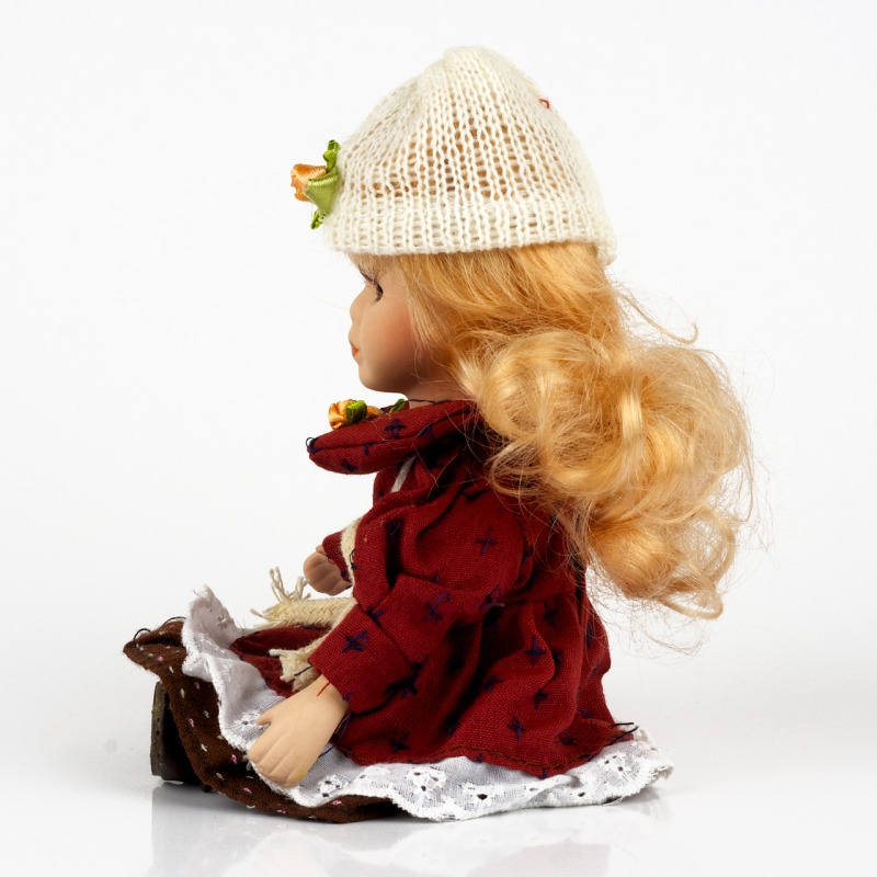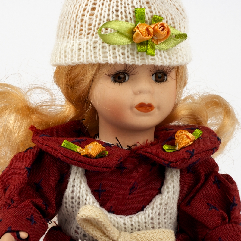 Porcelánová panenka má šatičky s vyšitými ozdobami, zakončené bílou krajkou. Na hlavě má pletenou bílou čepici s růžičkou. Botičky panenky jsou hnědé, šněrovací. Obličej je velice realisticky propracová do každého detailu. Dlouhé řasy, modré oči a rozpuštěné blonďaté vlásky.
