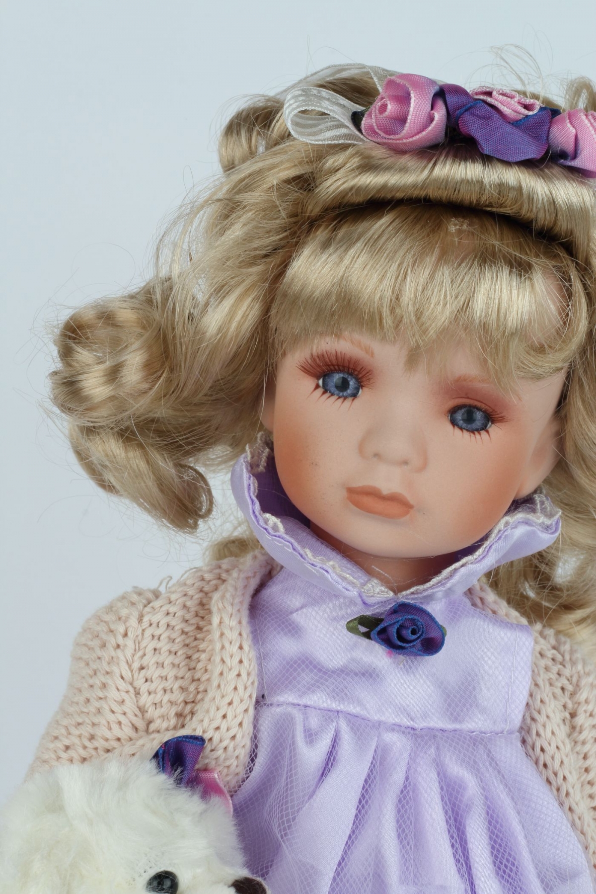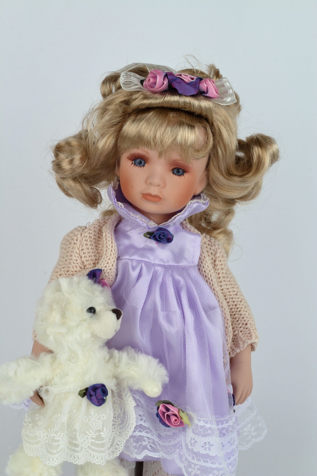 Stylová porcelánová panenka Apolena má něžné fialové šaty s květinovými prvky a v ruce drží bílého plyšového medvídka. Určitě si ji zamilujete!