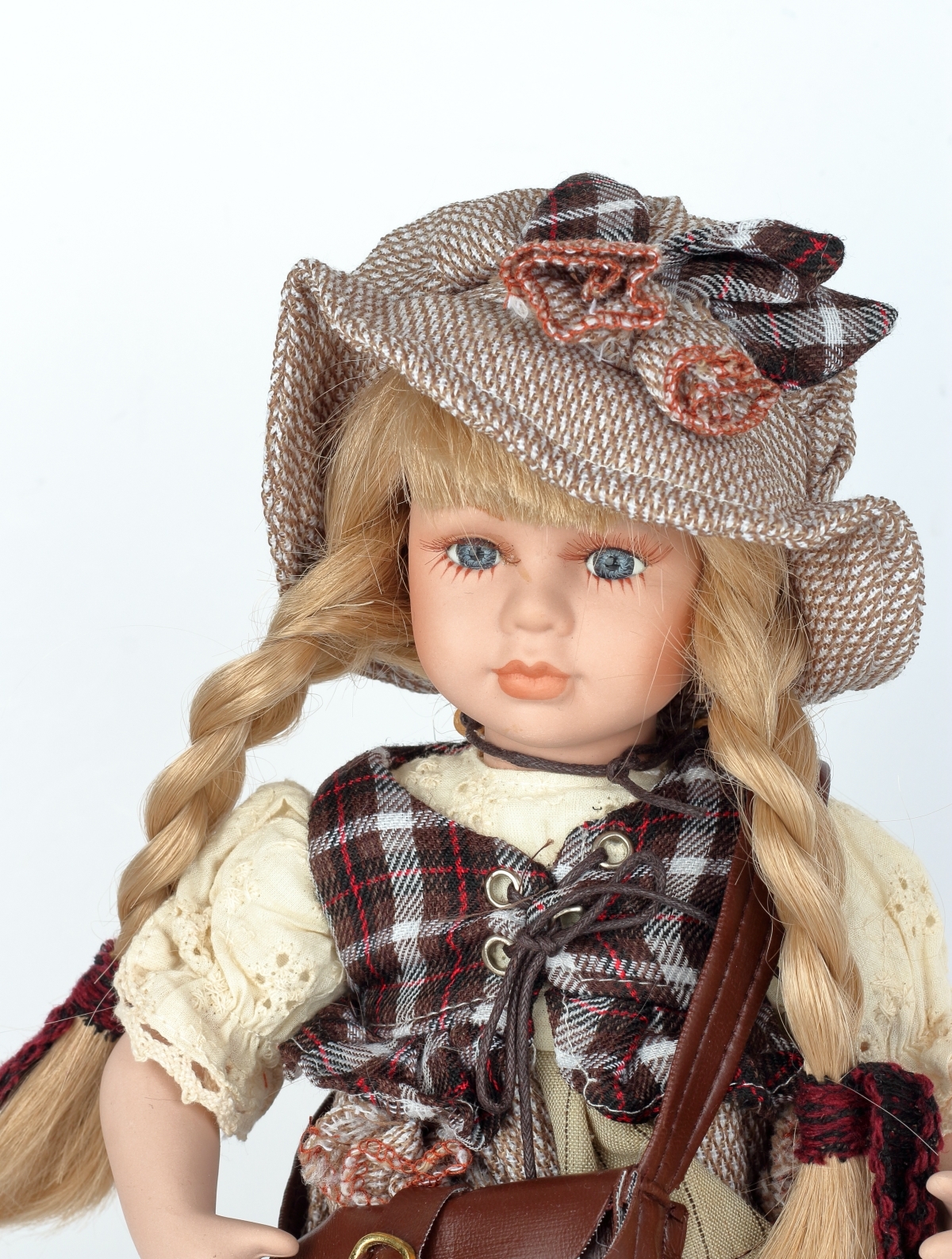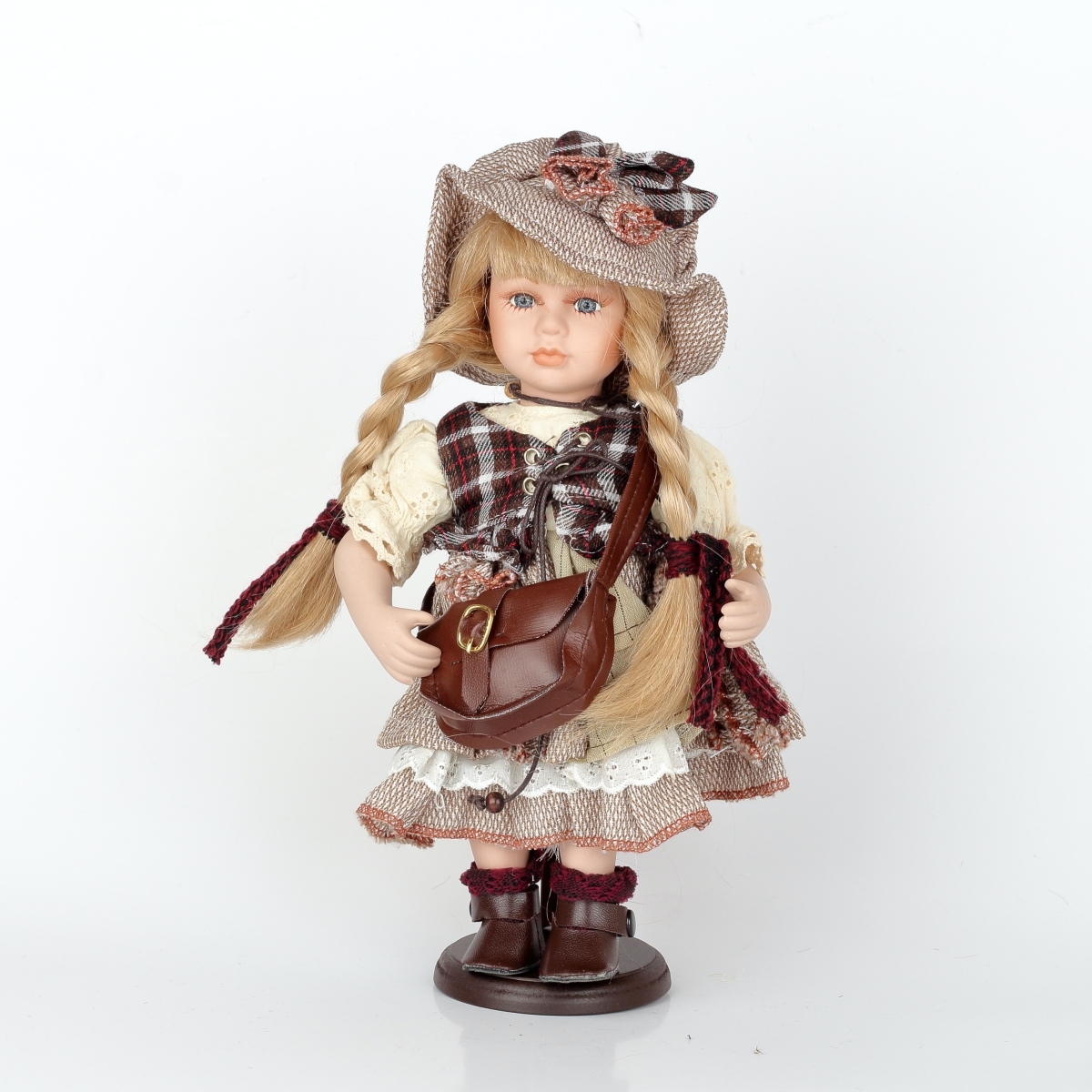 Porcelánová panenka, propracovaná do nejmenšího detailu, vám ve sbírce zkrátka rozhodně nesmí chybět! Krásně sladěné šaty doplňuje stylový klobouček, kabelka i náhrdelník na krku.