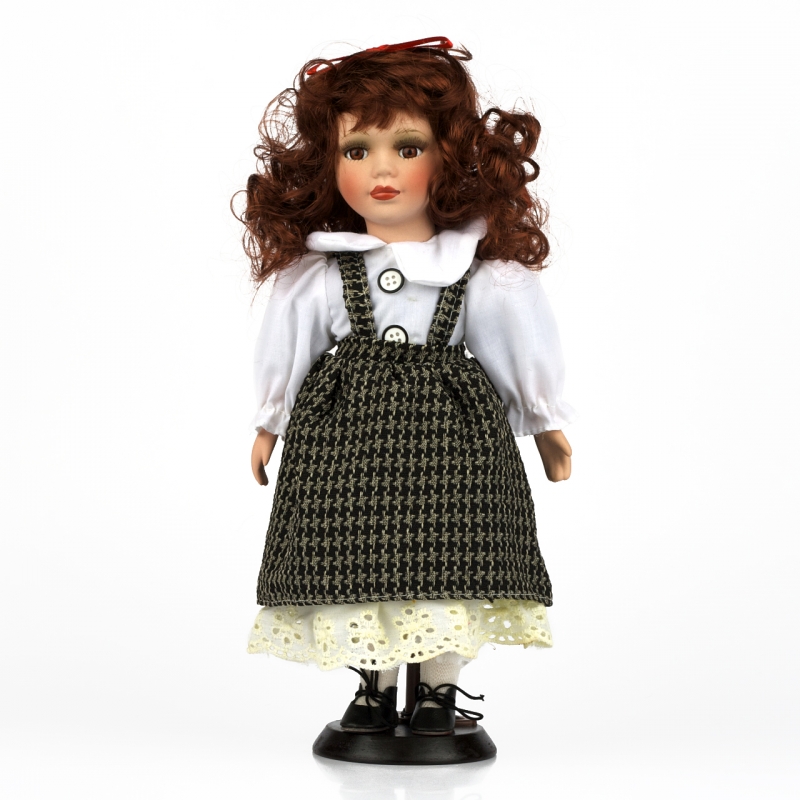 Porcelánová panenka má oblečeny tmavé šatičky, zdobené krajkou ve spodní části. Bílou košilku s knoflíky a límečkem. Její překrásné hnědé oči a tmavé vlásky, umocňují celkový dojem z pohledu na tuto panenku.