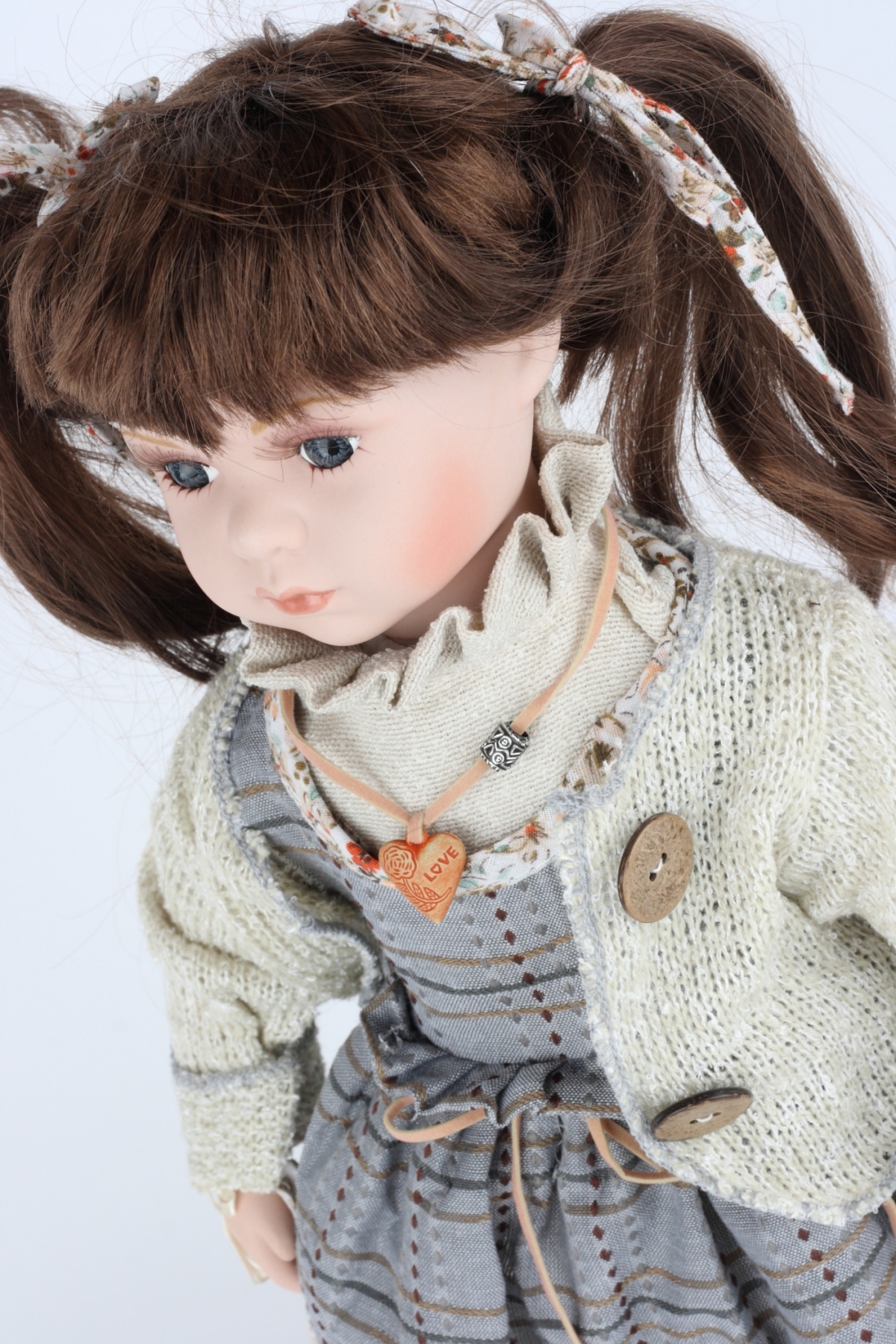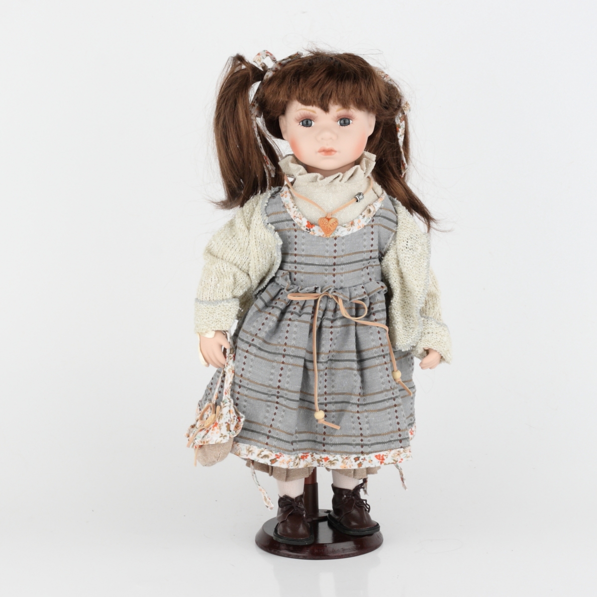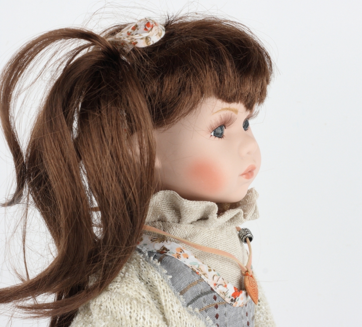 Porcelánová panenka Stela 40cm Vás ohromí svým realistickým vzhledem a krásnými venkovskými šaty. Je připevněná na stojánku, na kterém bude ozdobou jakékoli police ve vašem interiéru.