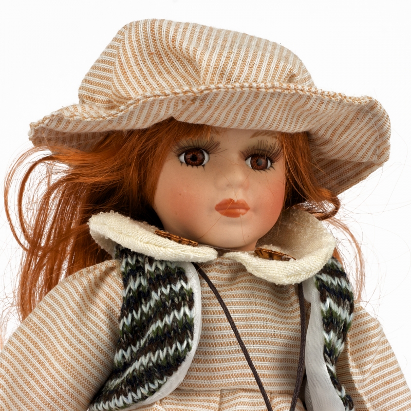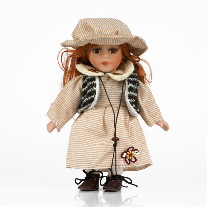 Porcelánová panenka v béžových šatičkách 20cm. Hlavička, ručičky a nožičky jsou vyrobeny z porcelánu. Velice krásný a působivý dekorativní doplněk.