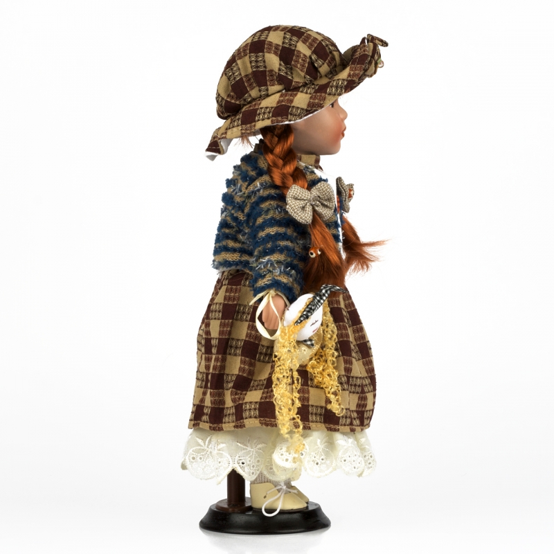 Porcelánová panenka má kostkované šaty, spodničku s krajkou a bílým svetýrek s ozdobnými knoflíčky, na kterém má pletenou vestičku s podšívkou. Tmavý klobouček s motýlkem pokrývá hlavičku s krásnými tmavými vlásky, pečlivě zapletenými do dvou copánků, které jsou ozdobeny gumičkou s motýlkem. Botičky má panenka bílé, šněrovací.